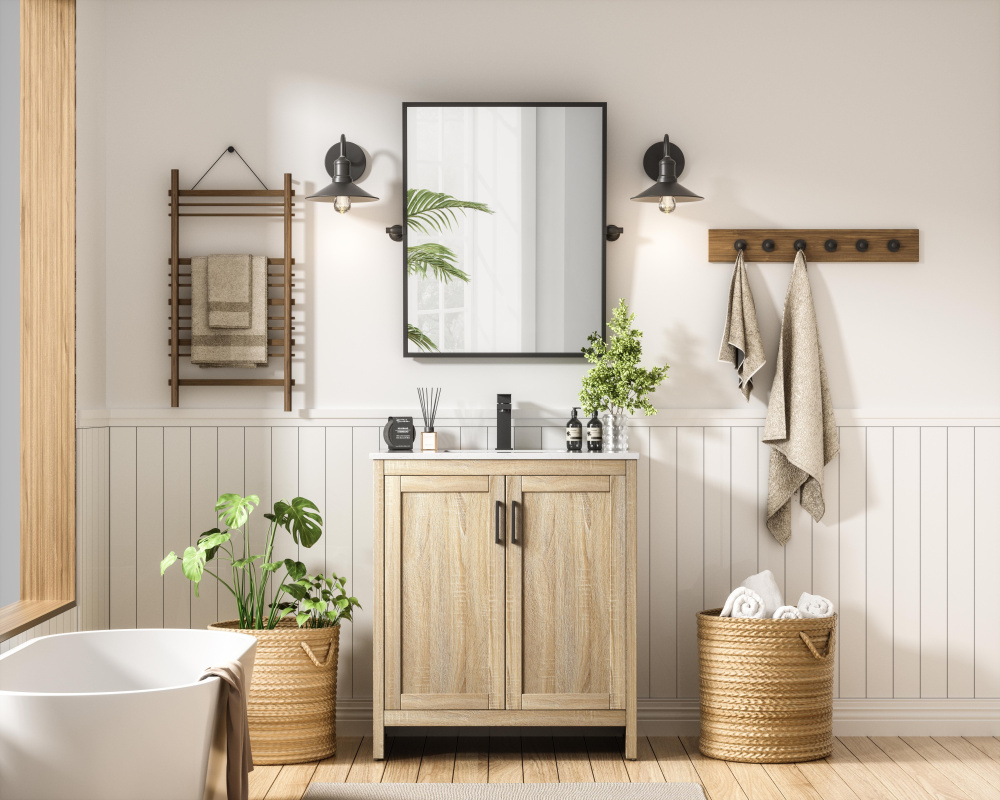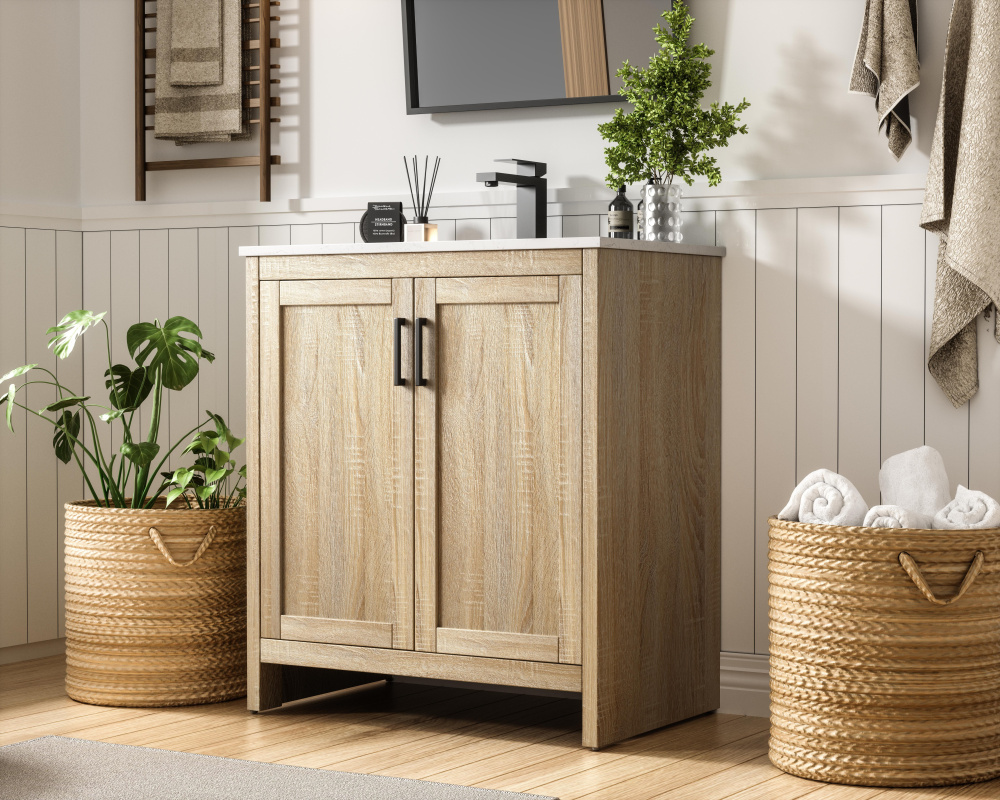 A natural wood-inspired finish adds warmth and texture to your bathroom.
