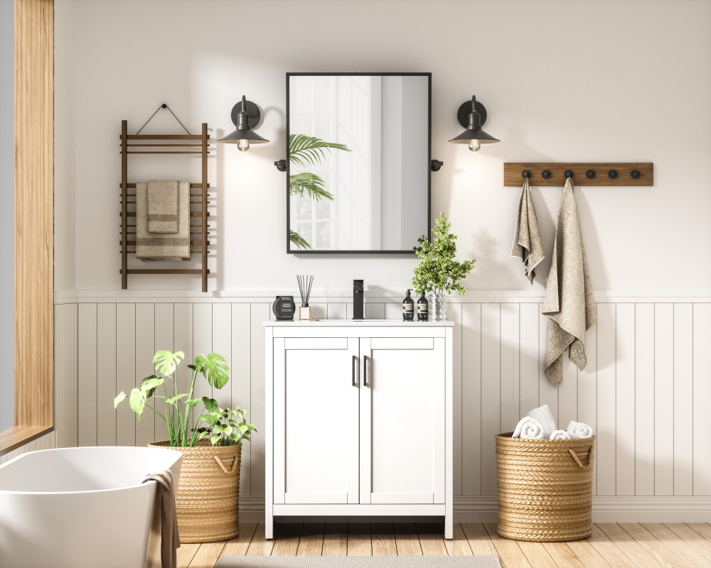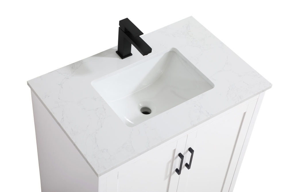 Redefine your bathroom with this transitional shaker-style vanity, designed to combine practicality with timeless aesthetics. Its clean lines and shaker-style door panels create a versatile look that complements both traditional and contemporary spaces. The engineered marble countertop, featuring a unique faux marbled pattern, adds a sophisticated focal point, while the integrated porcelain sink ensures durability and easy maintenance. The vanity includes a shelf with a smart U-shaped cutout, optimizing storage while accommodating plumbing. Crafted from sturdy MDF with a white finish, it brings a clean and inviting feel to your bathroom. Equipped with adjustable foot levelers for stability and a pre-drilled faucet hole for quick installation, this compact vanity delivers on both style and function. Best of all, it arrives fully assembled, ready to enhance your space right out of the box.