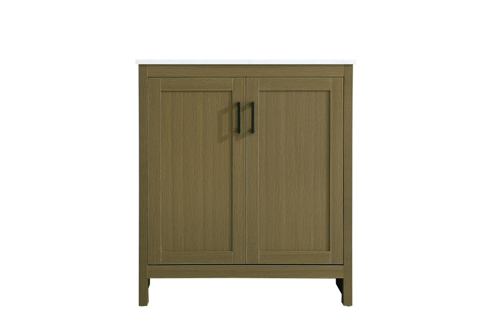 Redefine your bathroom with this transitional shaker-style vanity, designed to combine practicality with timeless aesthetics. Its clean lines and shaker-style door panels create a versatile look that complements both traditional and contemporary spaces. The engineered marble countertop, featuring a unique faux marbled pattern, adds a sophisticated focal point, while the integrated porcelain sink ensures durability and easy maintenance. The vanity includes a shelf with a smart U-shaped cutout, optimizing storage while accommodating plumbing. Crafted from sturdy MDF with a warm woodgrain finish, it brings a natural and inviting feel to your bathroom. Equipped with adjustable foot levelers for stability and a pre-drilled faucet hole for quick installation, this compact vanity delivers on both style and function. Best of all, it arrives fully assembled, ready to enhance your space right out of the box.