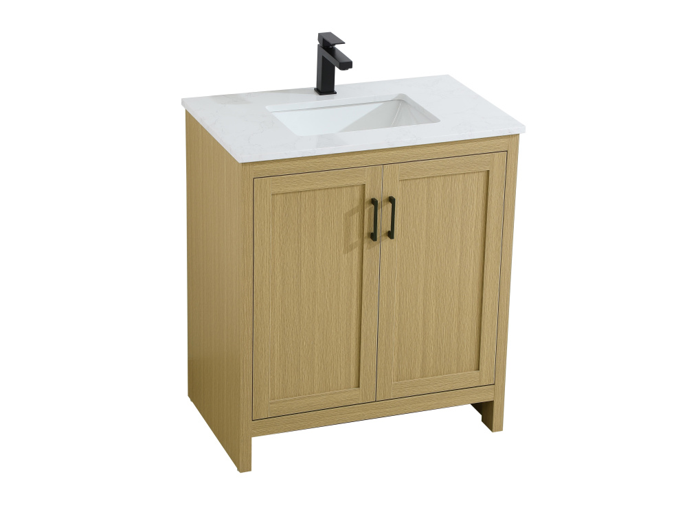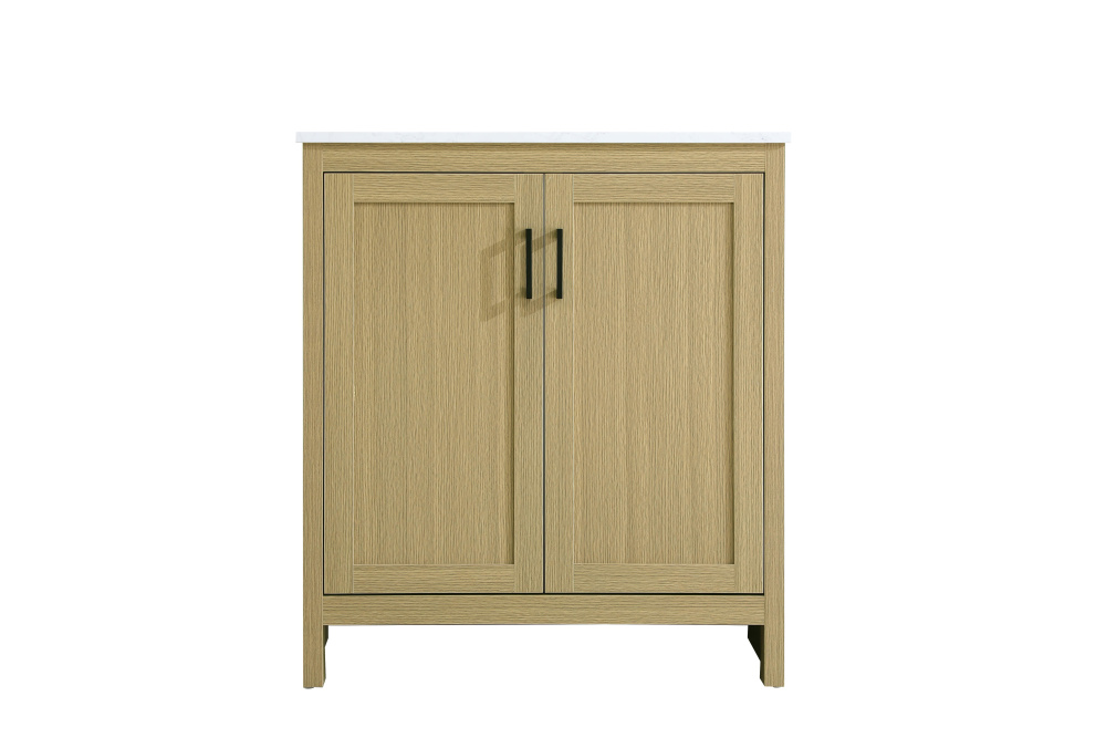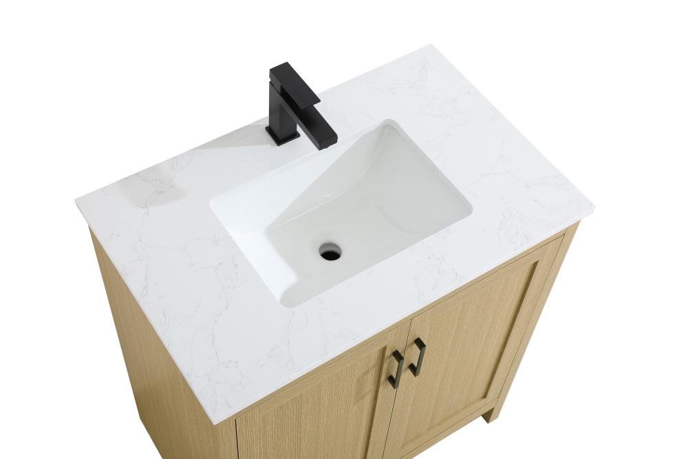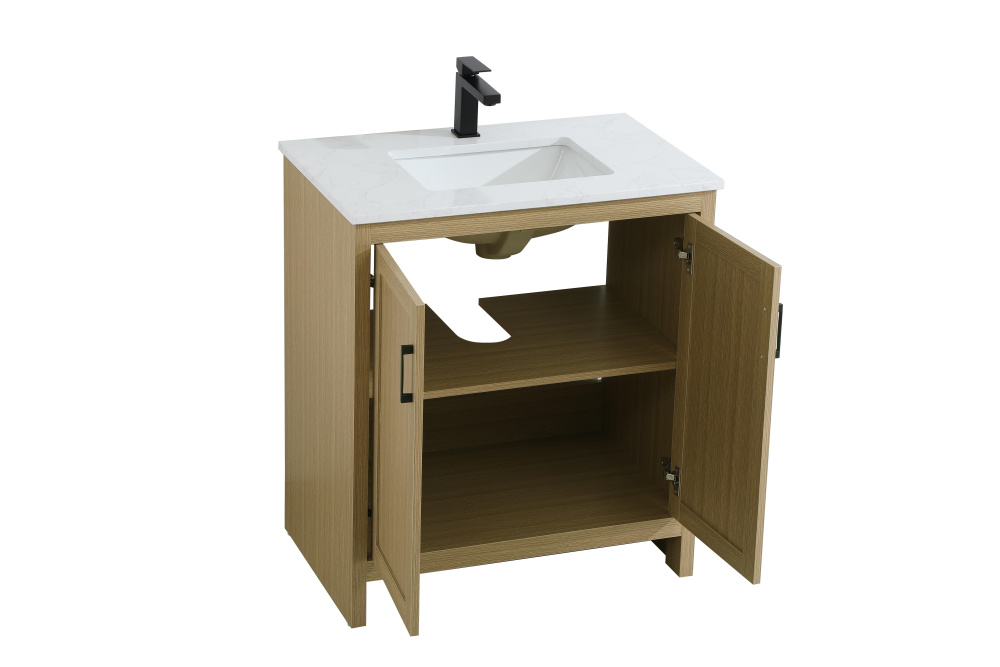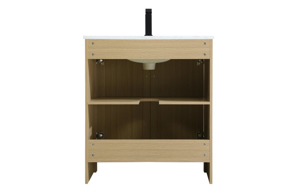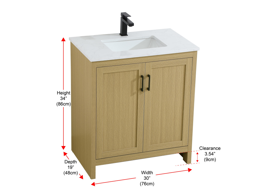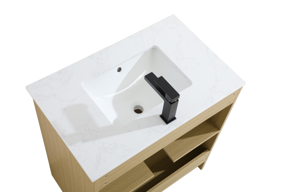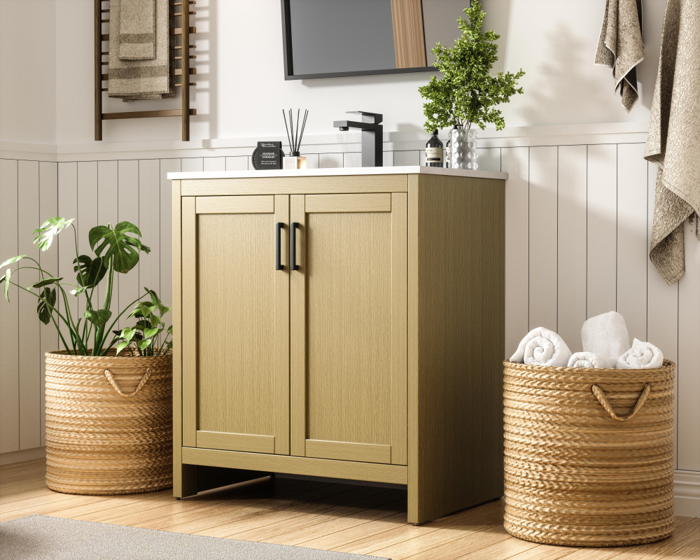 Redefine your bathroom with this transitional shaker-style vanity, designed to combine practicality with timeless aesthetics. Its clean lines and shaker-style door panels create a versatile look that complements both traditional and contemporary spaces. The engineered marble countertop, featuring a unique faux marbled pattern, adds a sophisticated focal point, while the integrated porcelain sink ensures durability and easy maintenance. The vanity includes a shelf with a smart U-shaped cutout, optimizing storage while accommodating plumbing. Crafted from sturdy MDF with a warm woodgrain finish, it brings a natural and inviting feel to your bathroom. Equipped with adjustable foot levelers for stability and a pre-drilled faucet hole for quick installation, this compact vanity delivers on both style and function. Best of all, it arrives fully assembled, ready to enhance your space right out of the box.