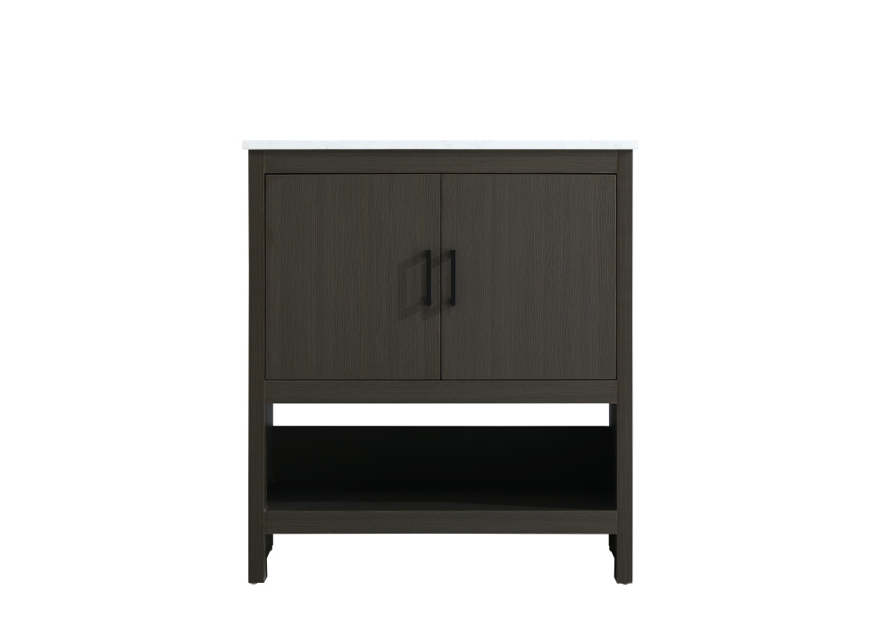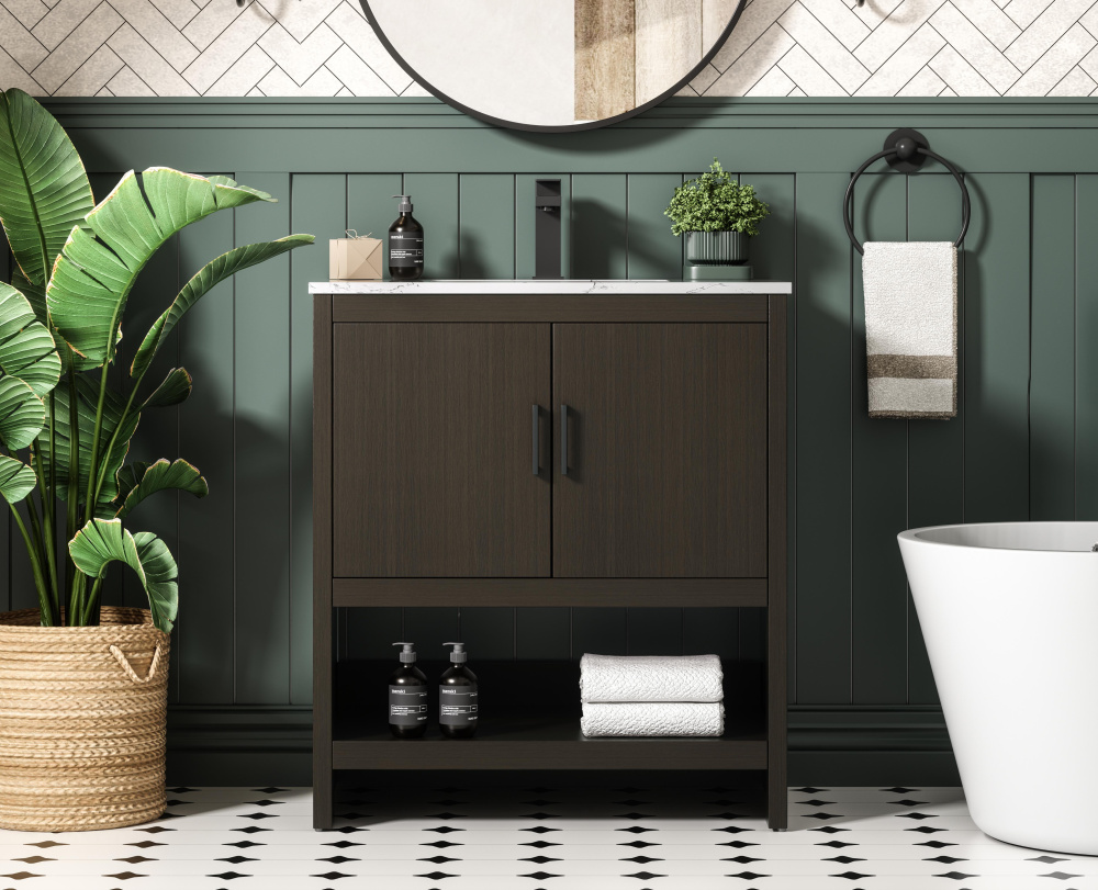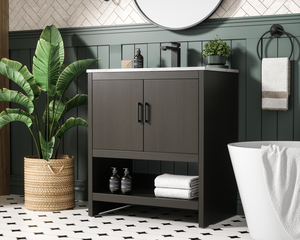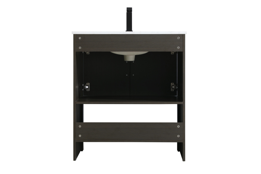 Bring modern style and practicality to your bathroom with this sleek vanity, designed to complement contemporary spaces. The flat-panel doors create a clean, minimalist look, while the open bottom shelf provides functional storage or a space to display decorative items. The engineered marble countertop showcases unique faux marbling, adding a refined and distinct touch to the design. The durable porcelain sink is easy to maintain, and the single pre-drilled faucet hole simplifies the installation process. Constructed from high-quality MDF with a versatile woodgrain finish, this vanity combines durability with timeless style. With adjustable foot levelers for stability on uneven floors and a fully assembled design, this piece offers a seamless addition to your bathroom.