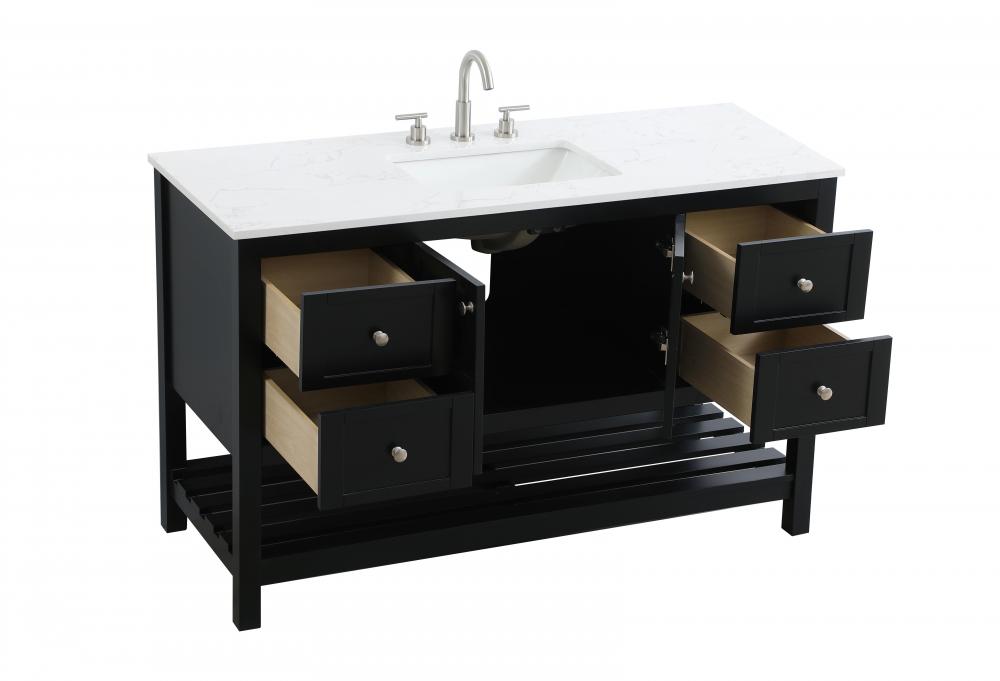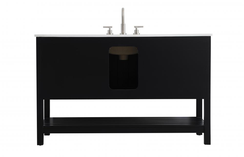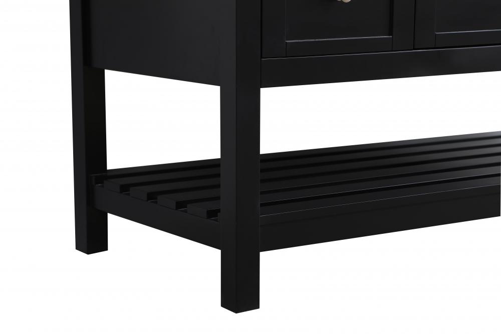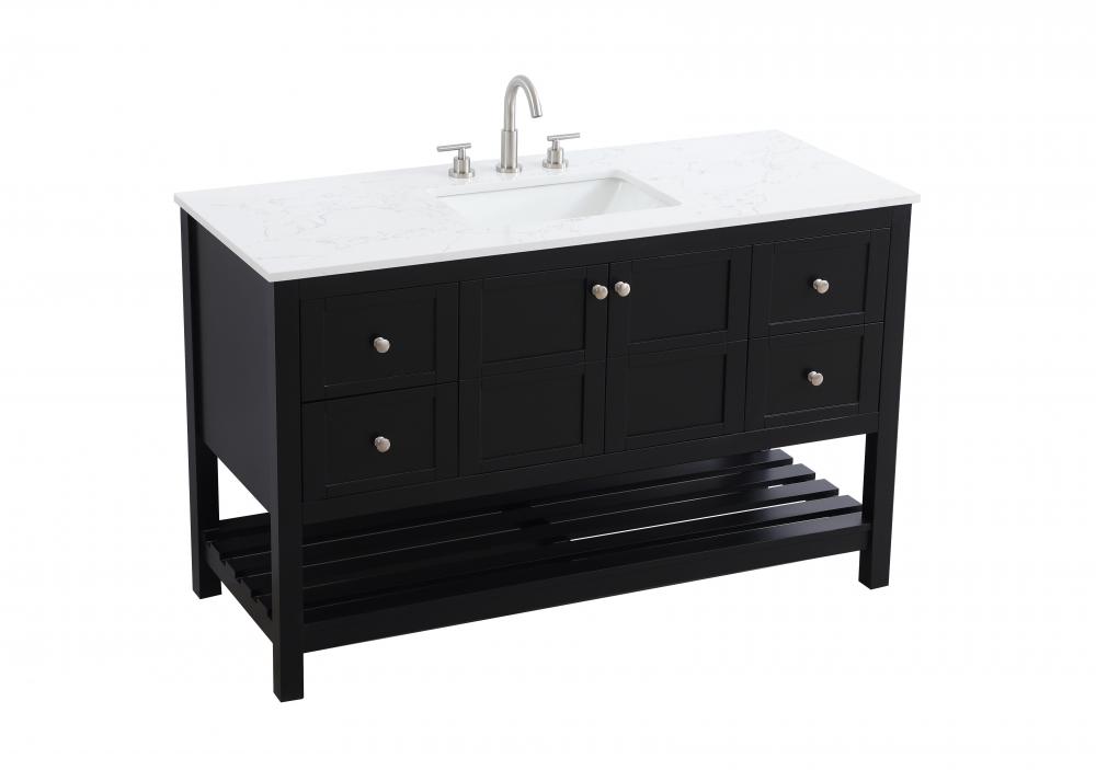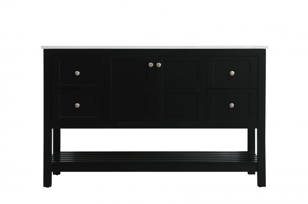 The Theo Collection Vanity effortlessly combines subtle beauty and practical luxury to elevate any bathroom or powder room. Its modern yet timeless design enhances your space without overwhelming it. The calacatta engineered marble countertop paired with a porcelain undermount sink exudes quiet sophistication, while the sturdy legs ensure lasting support. The brushed nickel hardware complements the classic black finish, with elegant pulls accenting the two cabinet doors that open to reveal generous storage space. An additional slated shelf provides perfect organization for towels or other bathroom essentials. Whether placed in your master bath or a guest powder room, this vanity brings refined elegance and functionality, making it the ideal choice for any home.