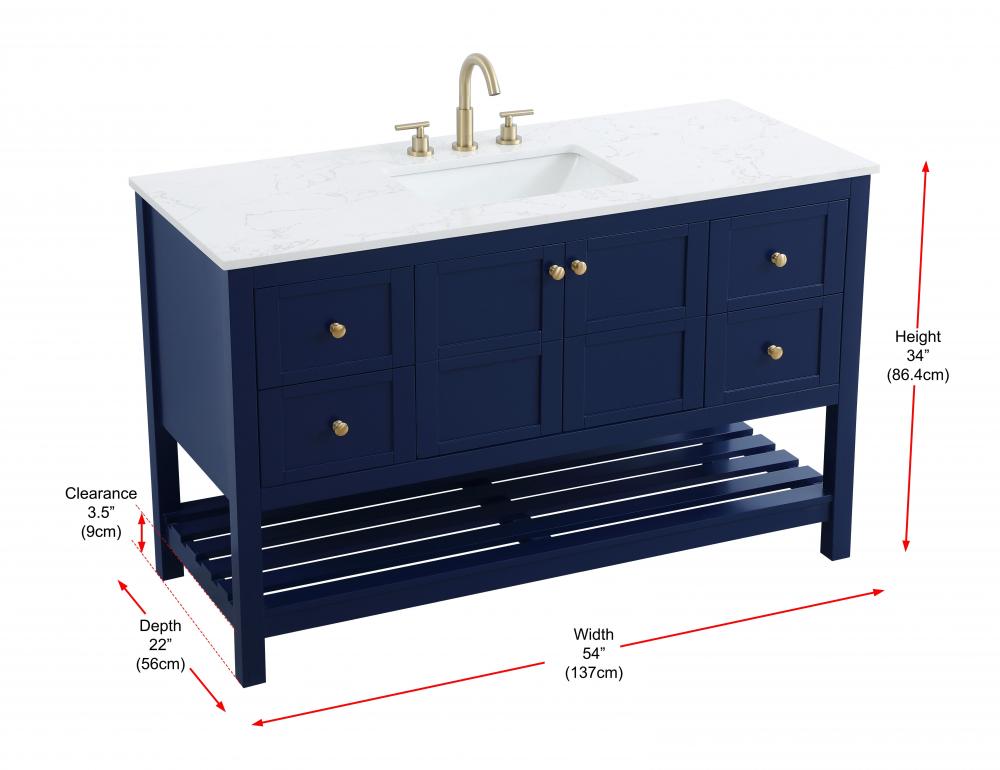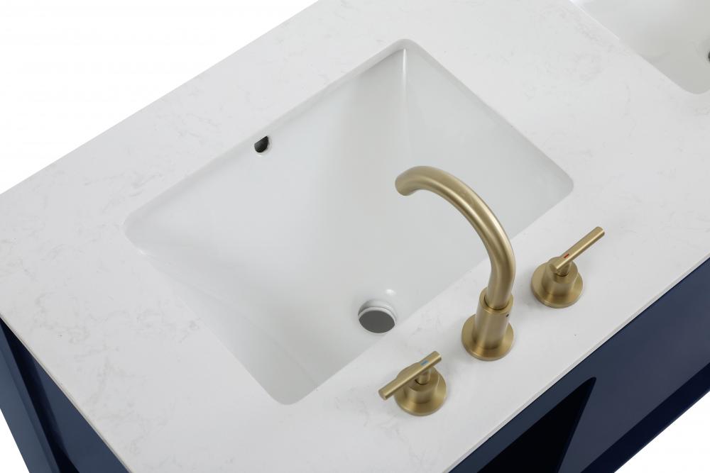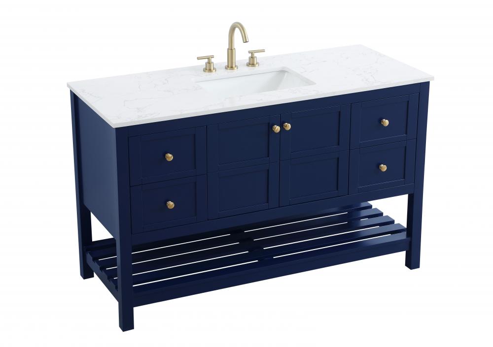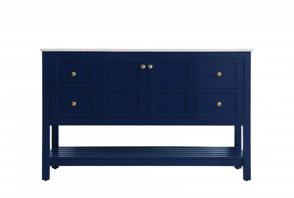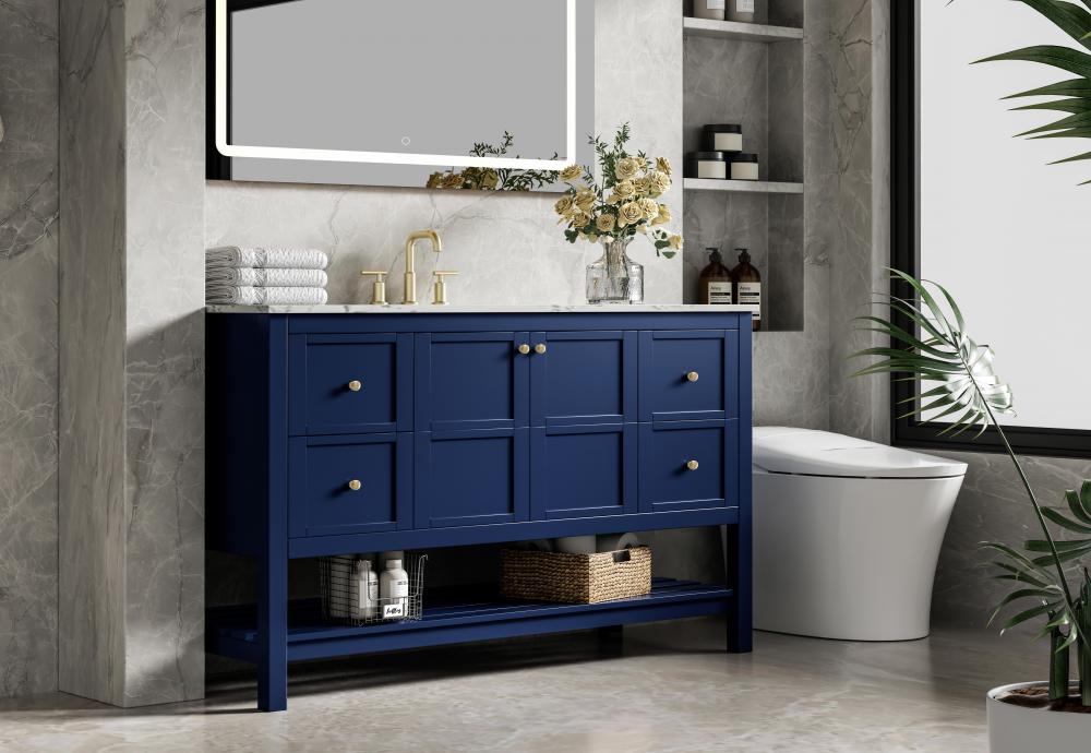 The Theo Collection Vanity effortlessly combines subtle beauty and practical luxury to elevate any bathroom or powder room. Its modern yet timeless design enhances your space without overwhelming it. The calacatta engineered marble countertop paired with a porcelain undermount sink exudes quiet sophistication, while the sturdy legs ensure lasting support. The gold hardware complements the trendy blue finish, with elegant pulls accenting the two cabinet doors that open to reveal generous storage space. An additional slated shelf provides perfect organization for towels or other bathroom essentials. Whether placed in your master bath or a guest powder room, this vanity brings refined elegance and functionality, making it the ideal choice for any home.