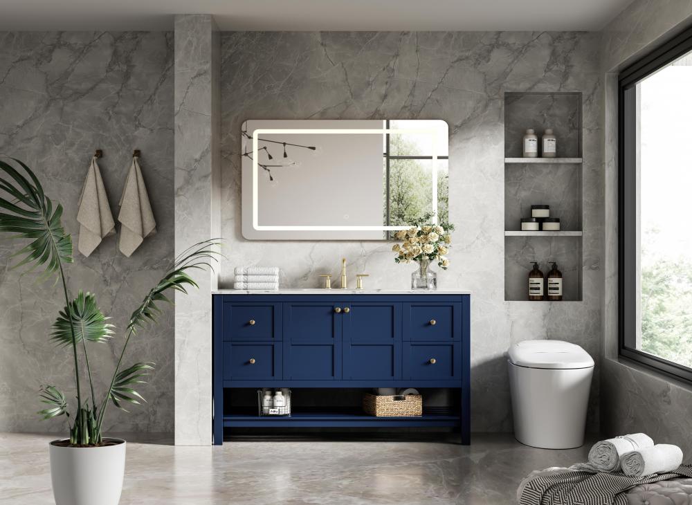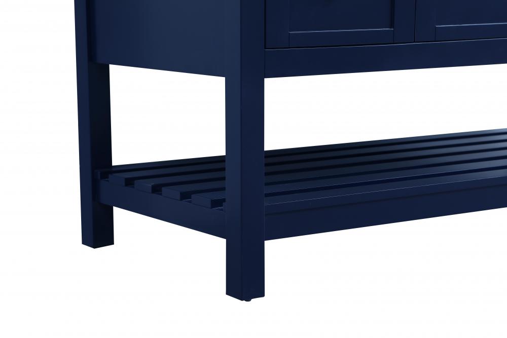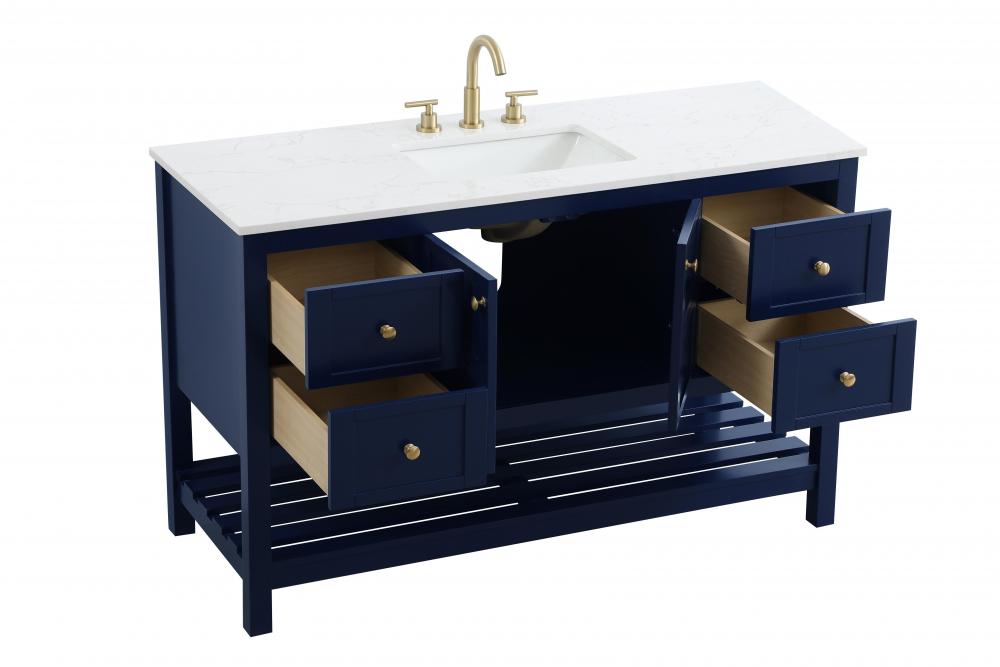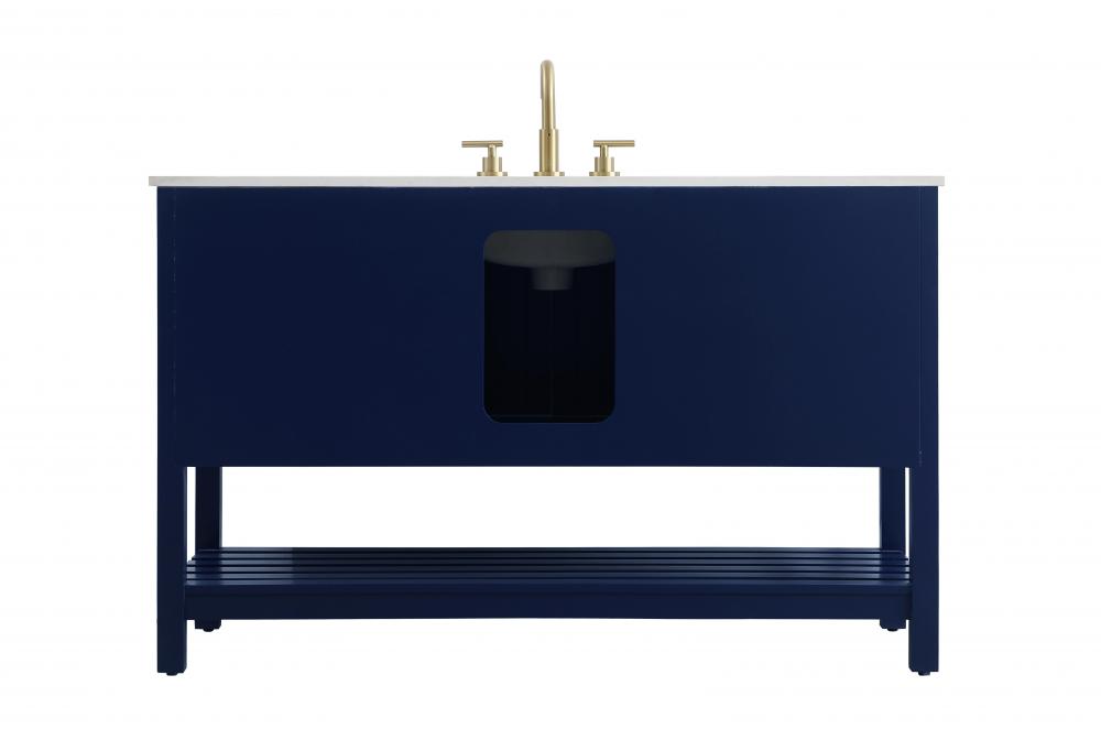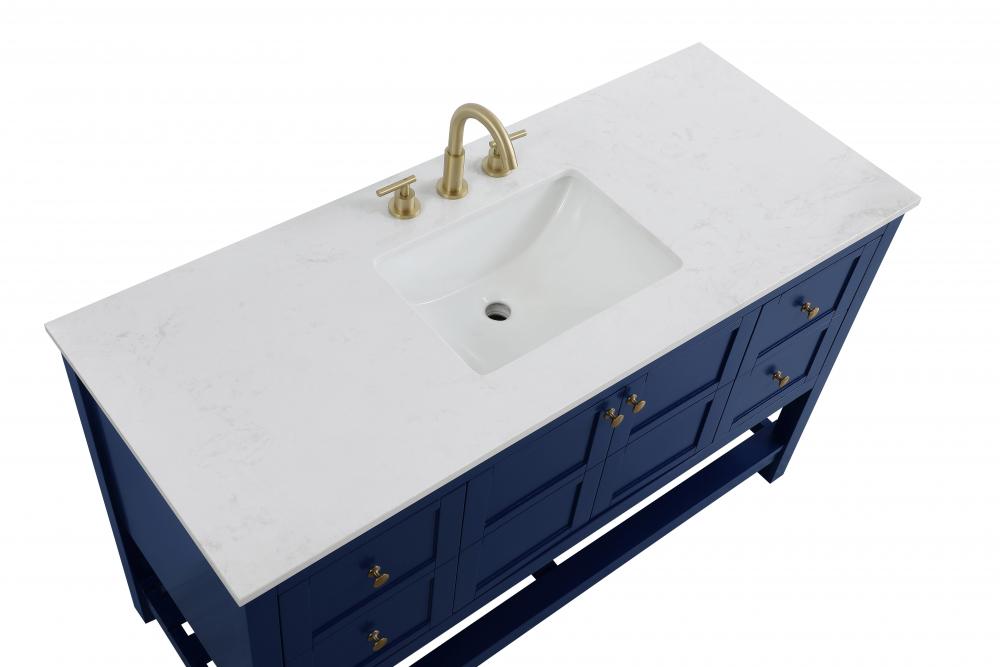 The Theo Collection Vanity effortlessly combines subtle beauty and practical luxury to elevate any bathroom or powder room. Its modern yet timeless design enhances your space without overwhelming it. The calacatta engineered marble countertop paired with a porcelain undermount sink exudes quiet sophistication, while the sturdy legs ensure lasting support. The gold hardware complements the trendy blue finish, with elegant pulls accenting the two cabinet doors that open to reveal generous storage space. An additional slated shelf provides perfect organization for towels or other bathroom essentials. Whether placed in your master bath or a guest powder room, this vanity brings refined elegance and functionality, making it the ideal choice for any home.