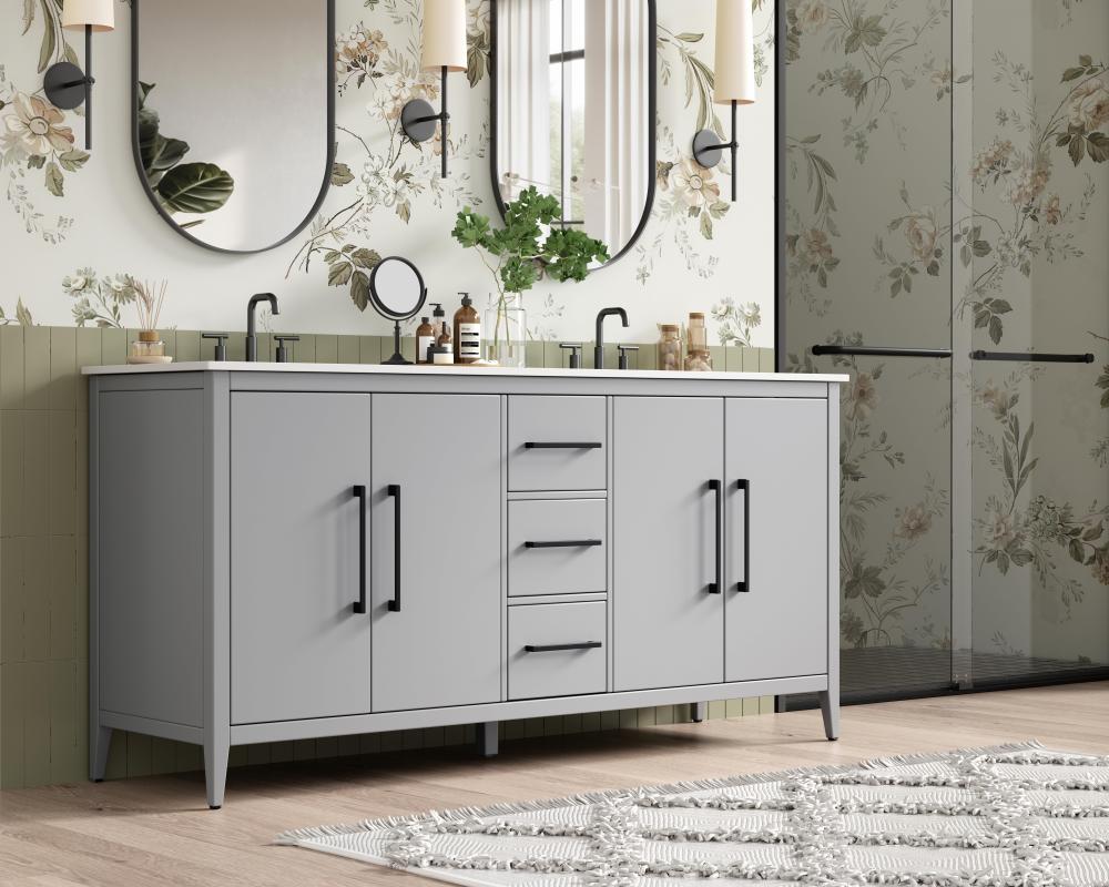 Bring both elegance and practicality to your bathroom with this transitional vanity, available in a selection of rich finishes that highlight the beauty of faux wood grain in shades of mocha, chestnut, and honey, along with classic white and modern grey. The flat door panels and sleek black metal pulls create a minimalist yet refined aesthetic, while the soft-closing drawers and tapered legs with levelers provide smooth, functional operation. Topped with a luxurious white engineered marble countertop and featuring a porcelain sink, this vanity combines timeless style with modern efficiency. Thoughtfully designed with U-shaped cutout for plumbing, it offers ample storage and easy installation, making it the perfect centerpiece for any bathroom.