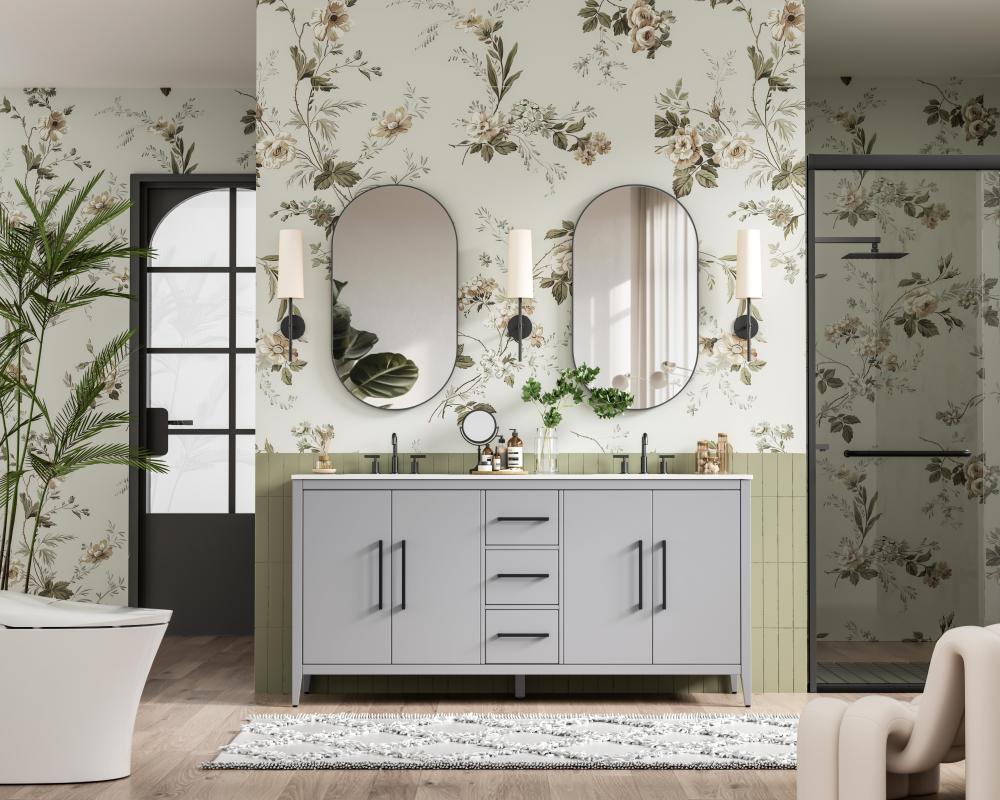 The vanity stands on tapered 5-inch solid wood legs with levelers for a balanced, polished look, combining modern style with practicality.