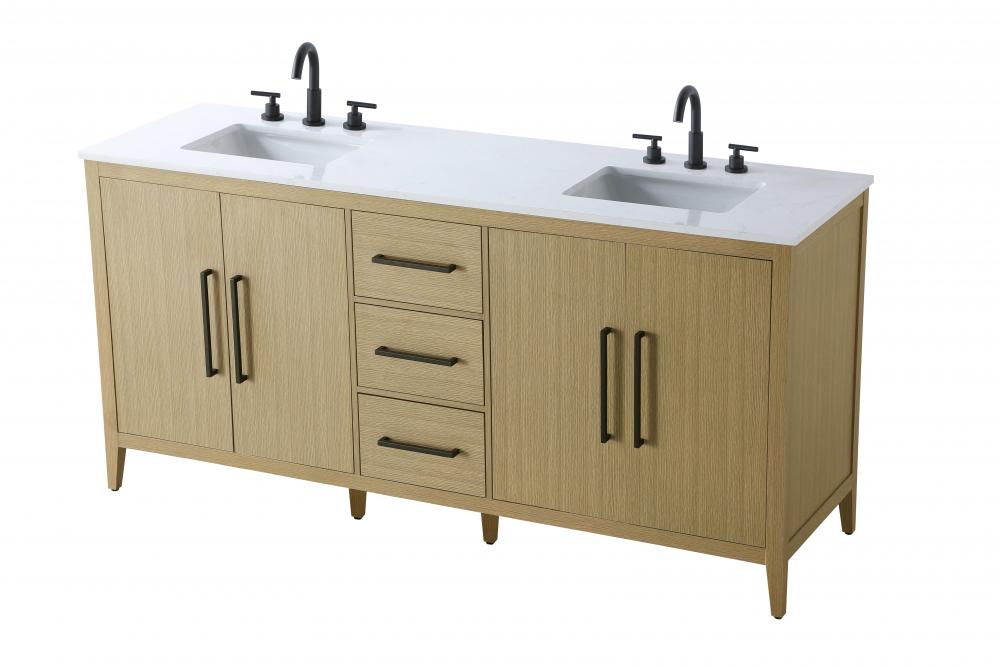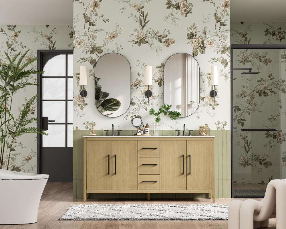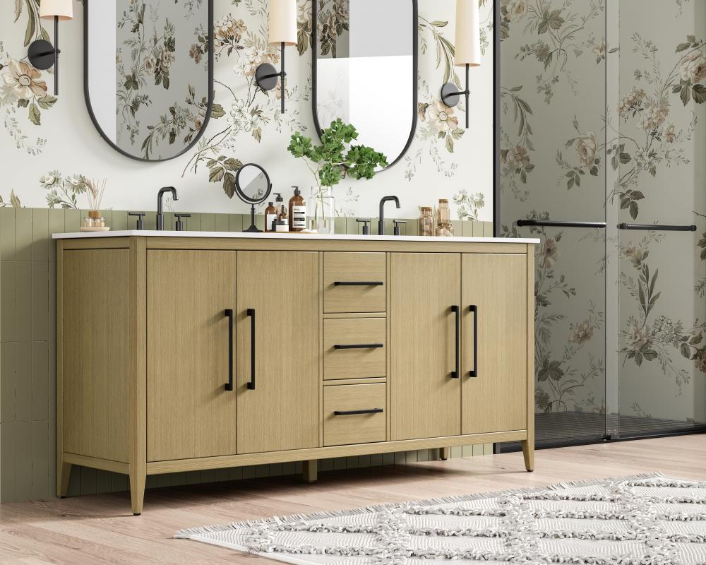 The vanity stands on tapered 5-inch solid wood legs with levelers for a balanced, polished look, combining modern style with practicality.