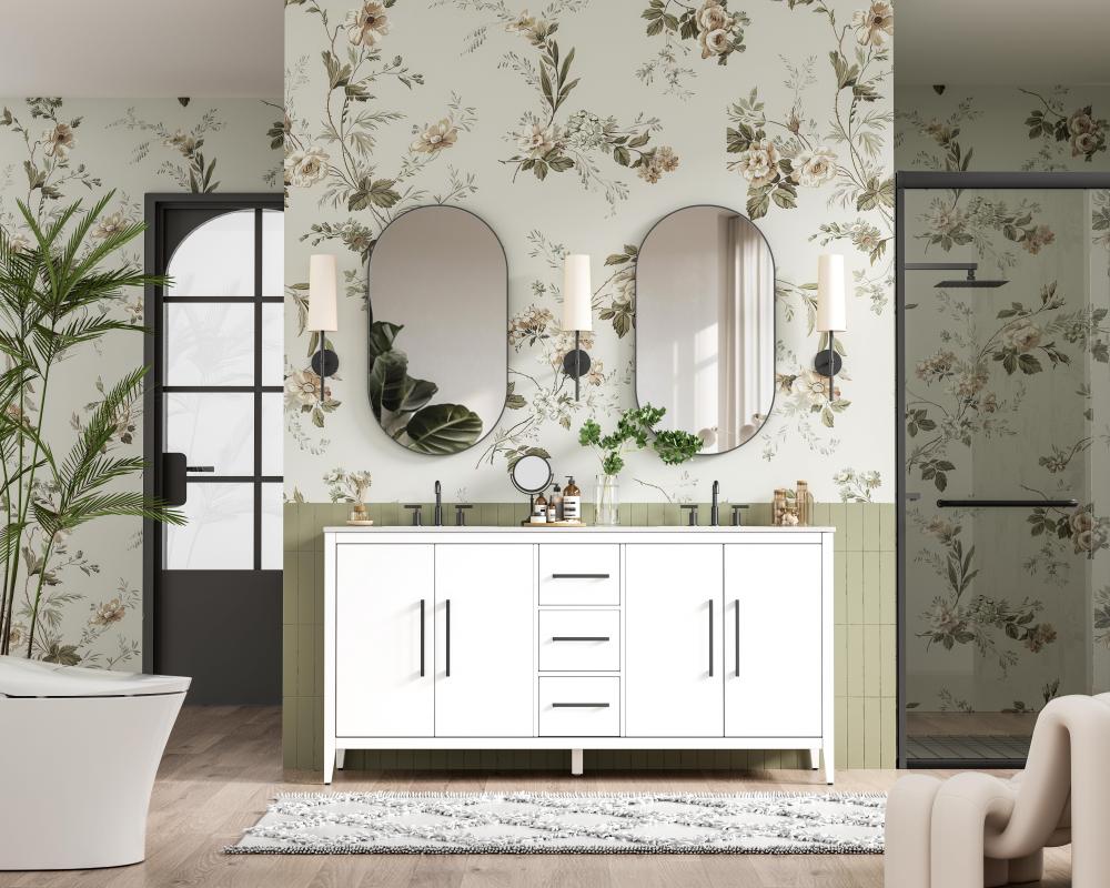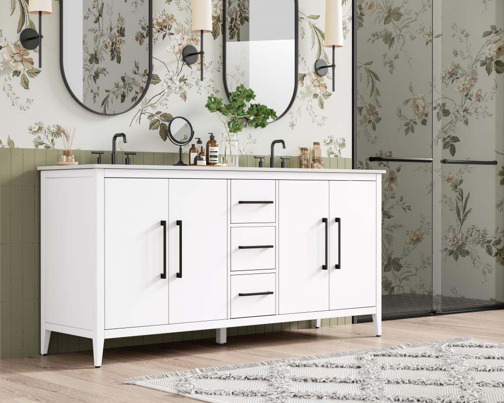 Bring both elegance and practicality to your bathroom with this transitional vanity, available in a selection of rich finishes that highlight the beauty of faux wood grain in shades of mocha, chestnut, and honey, along with classic white and modern grey. The flat door panels and sleek black metal pulls create a minimalist yet refined aesthetic, while the soft-closing drawers and tapered legs with levelers provide smooth, functional operation. Topped with a luxurious white engineered marble countertop and featuring a porcelain sink, this vanity combines timeless style with modern efficiency. Thoughtfully designed with U-shaped cutout for plumbing, it offers ample storage and easy installation, making it the perfect centerpiece for any bathroom.