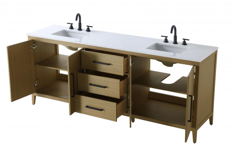 The vanity stands on tapered 5-inch solid wood legs with levelers for a balanced, polished look, combining modern style with practicality.