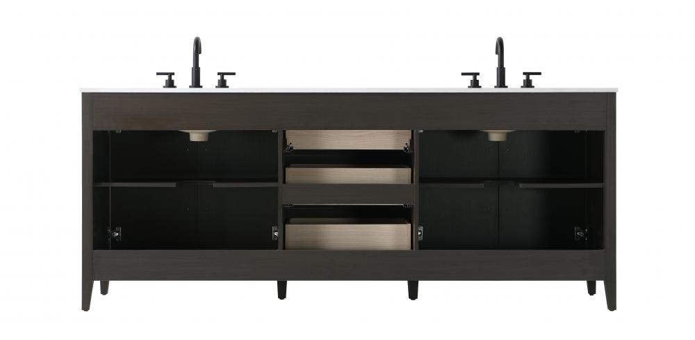 Bring both elegance and practicality to your bathroom with this transitional vanity, available in a selection of rich finishes that highlight the beauty of faux wood grain in shades of mocha, chestnut, and honey, along with classic white and modern grey. The flat door panels and sleek black metal pulls create a minimalist yet refined aesthetic, while the soft-closing drawers and tapered legs with levelers provide smooth, functional operation. Topped with a luxurious white engineered marble countertop and featuring a porcelain sink, this vanity combines timeless style with modern efficiency. Thoughtfully designed with U-shaped cutout for plumbing, it offers ample storage and easy installation, making it the perfect centerpiece for any bathroom.