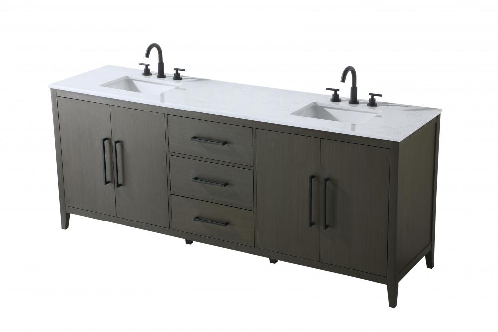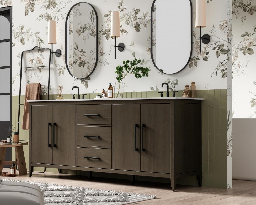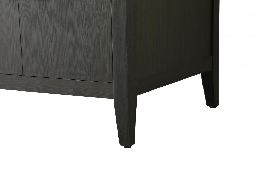 The vanity stands on tapered 5-inch solid wood legs with levelers for a balanced, polished look, combining modern style with practicality.