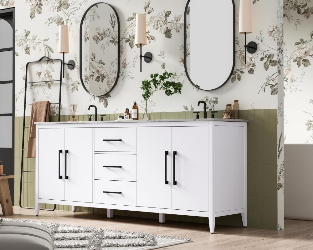 Bring both elegance and practicality to your bathroom with this transitional vanity, available in a selection of rich finishes that highlight the beauty of faux wood grain in shades of mocha, chestnut, and honey, along with classic white and modern grey. The flat door panels and sleek black metal pulls create a minimalist yet refined aesthetic, while the soft-closing drawers and tapered legs with levelers provide smooth, functional operation. Topped with a luxurious white engineered marble countertop and featuring a porcelain sink, this vanity combines timeless style with modern efficiency. Thoughtfully designed with U-shaped cutout for plumbing, it offers ample storage and easy installation, making it the perfect centerpiece for any bathroom.