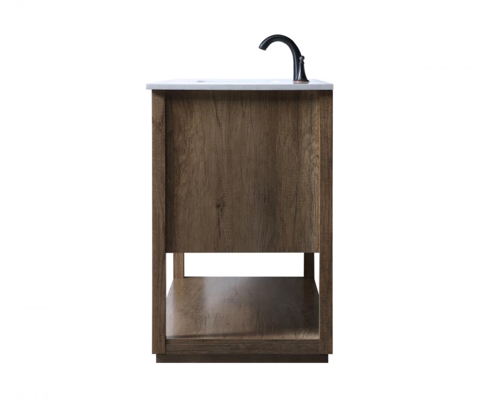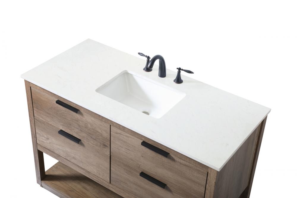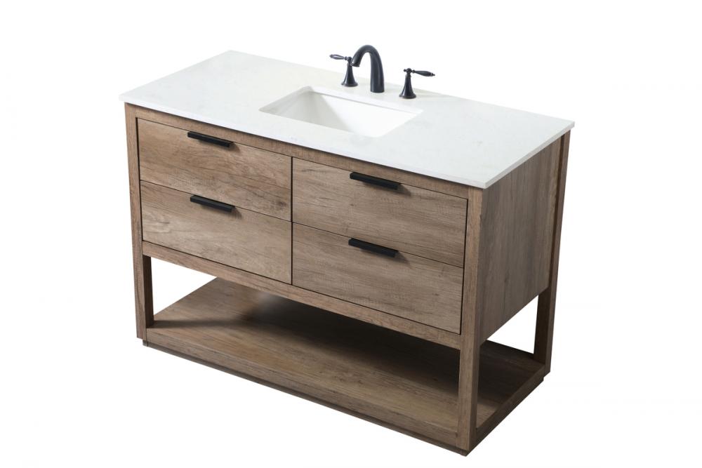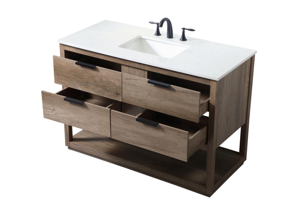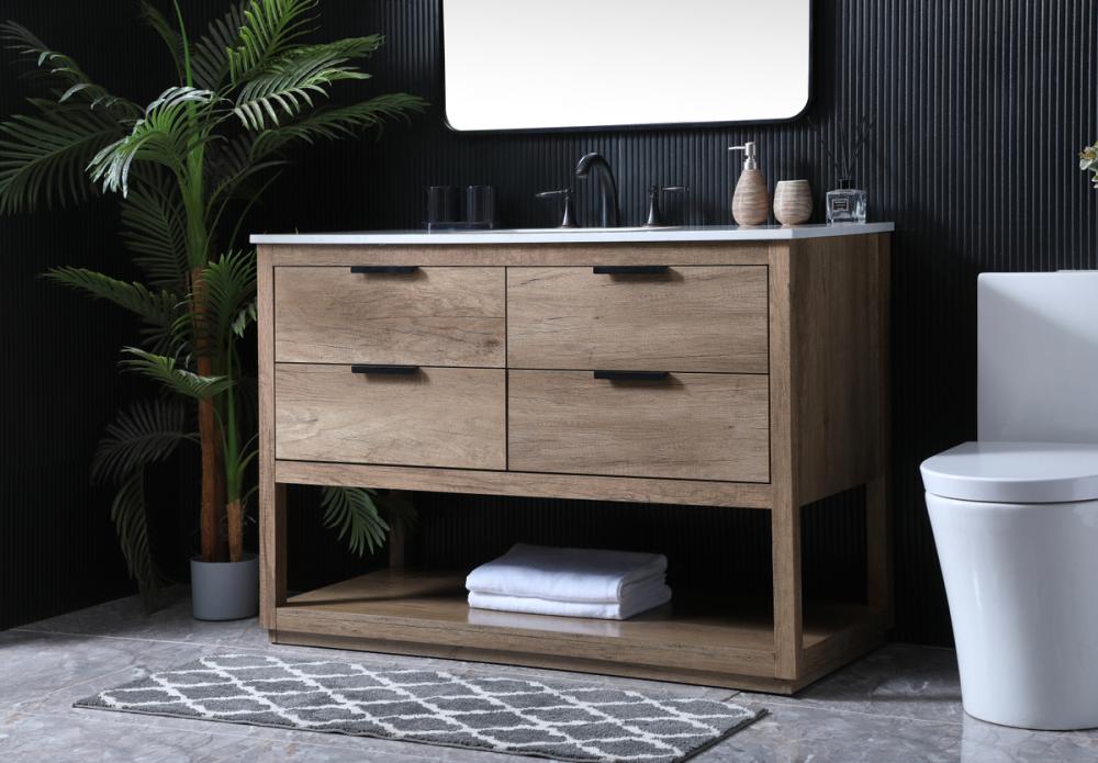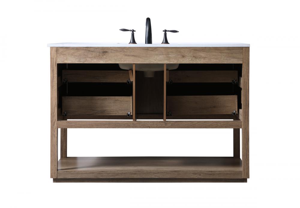Featuring an open shelf at the bottom for extra storage, the vanity provides a convenient space to showcase decor or store essentials, adding functionality and style to your bathroom.