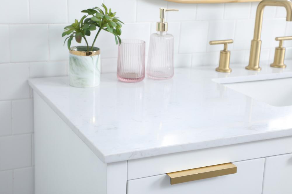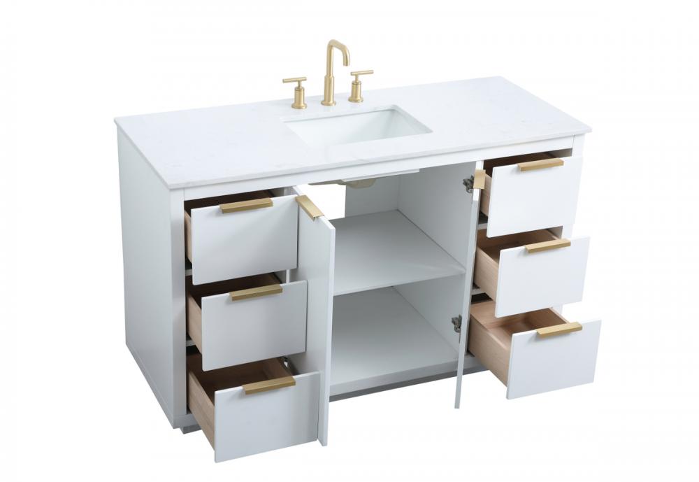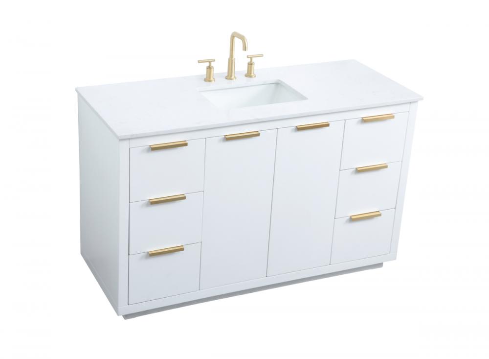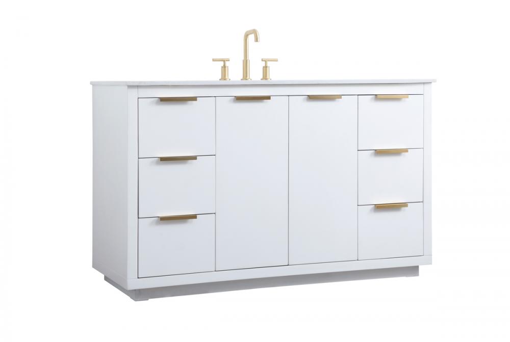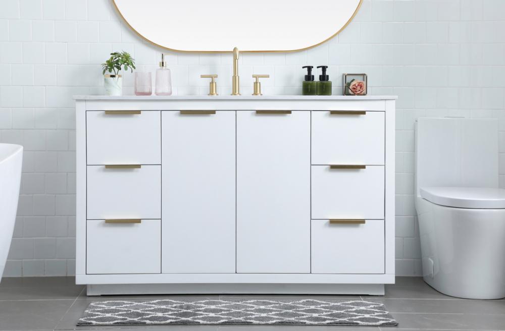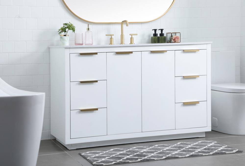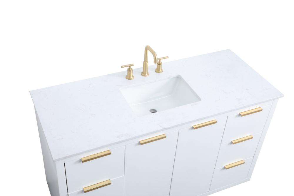 Upgrade your bathroom effortlessly with our stylish 54-inch vanity, showcasing an engineered marble top with a chic straight edge cut. The combination of six functional soft-close drawer and a convenient cabinet offers a perfect balance of design elegance and versatile storage. With an undermount porcelain sink, this vanity seamlessly blends timeless elegance with practical functionality. Adorned with sleek pulls, it adds a modern touch, enhancing the overall aesthetic. With three pre-drilled holes, it allows you to personalize your bathroom by choosing the perfect widespread faucet. Redefine your bathroom experience with this compact yet impactful vanity that optimizes space without compromising style.