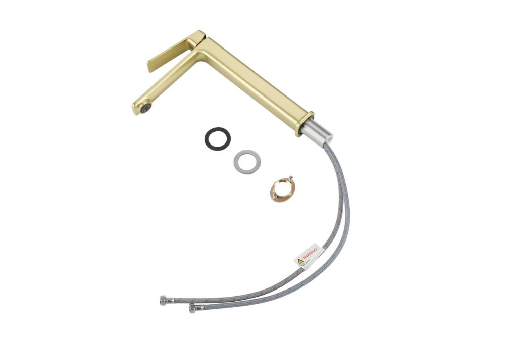 Our vanity faucet, featuring a single-handle design, ensures effortless water control for your convenience. Crafted from durable brass, this faucet not only resists corrosion but also brings a touch of contemporary sophistication to your vanity while promising long-lasting durability. With supply lines included, installation becomes a hassle-free endeavor, saving your valuable time. The handle's clear indicators for hot and cold temperatures make selecting your desired water temperature a simple and confident task. Standing tall, this compact faucet design is versatile and effortlessly complements various vanity styles. Its single-hole installation design ensures an easy setup without the need for complex installations or extra holes. Offering a maximum flow rate of 1.5 gallons per minute at 60 PSI, this faucet delivers a gentle yet efficient water flow, aiding in water conservation and reduced utility bills. Equipped with a single self-contained ceramic disc valve, this faucet ensures lasting reliability and precise volume and temperature control, ensuring a dependable performance for years to come.
