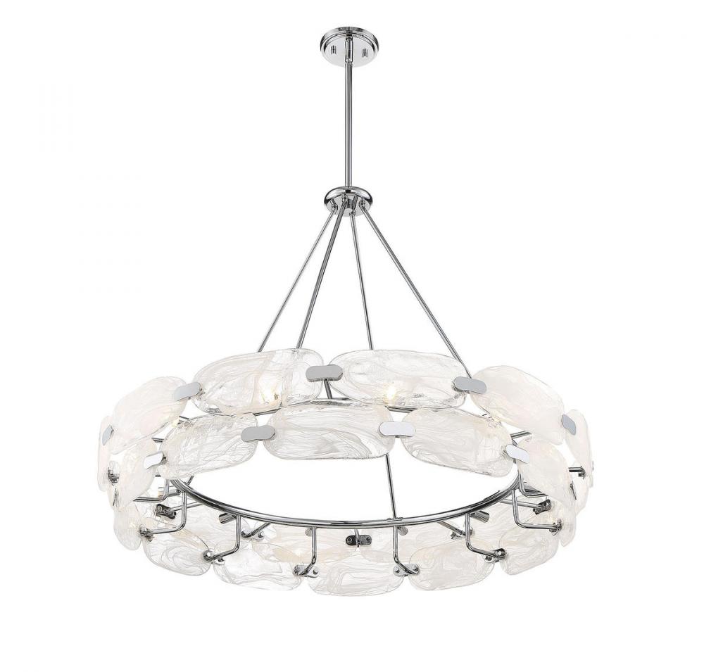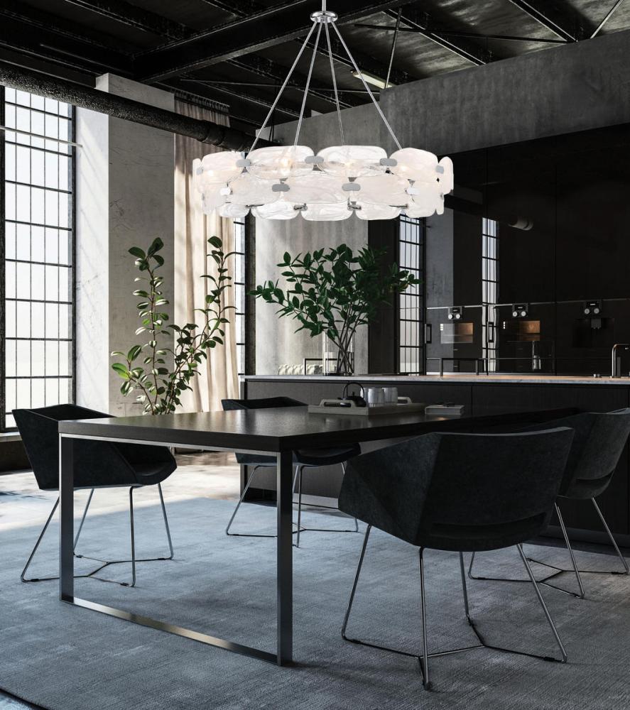 For a truly beautiful and unique lighting look, consider bringing in the Vasare 12-light pendant from Savoy House. Its sleek, contemporary circular shape flaunts a ring of hand-made marble glass, each pane showcasing totally unique swirls, united by a simple structure that is finished in chrome. It is often said that lighting is the jewelry of the home and Vasare, with its stunning glass and metal clasps, is a perfect example of this saying! Great for use in a wide variety of spaces, such as kitchens, living rooms and even entryways. This fixture is 38" in width and has an adjustable height that ranges from 37" to 83".