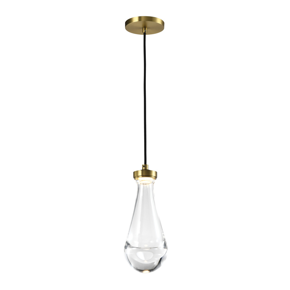 LED 5" Mini-Pendant with solid heavy clear glass shaped as a rain drop. Refined metal details with our premium aged brass finish. Adjustable arms for unique designs and integrated Replaceable LED with 3CCT 3000K, 3500K and 4000K.