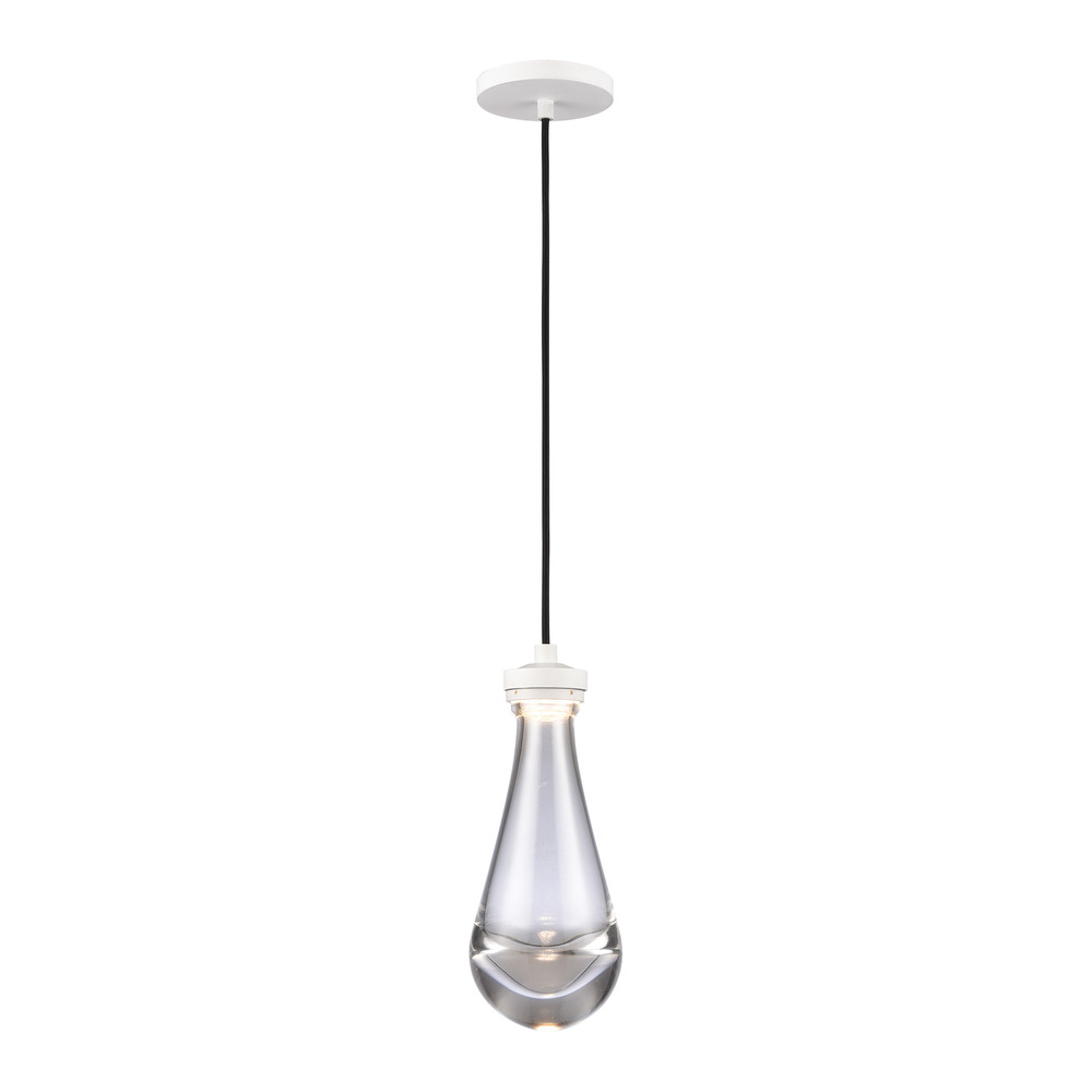 LED 5" Mini-Pendant with solid heavy clear glass shaped as a rain drop. Refined metal details with our chic matte white finish. Adjustable arms for unique designs and integrated Replaceable LED with 3CCT 3000K, 3500K and 4000K.