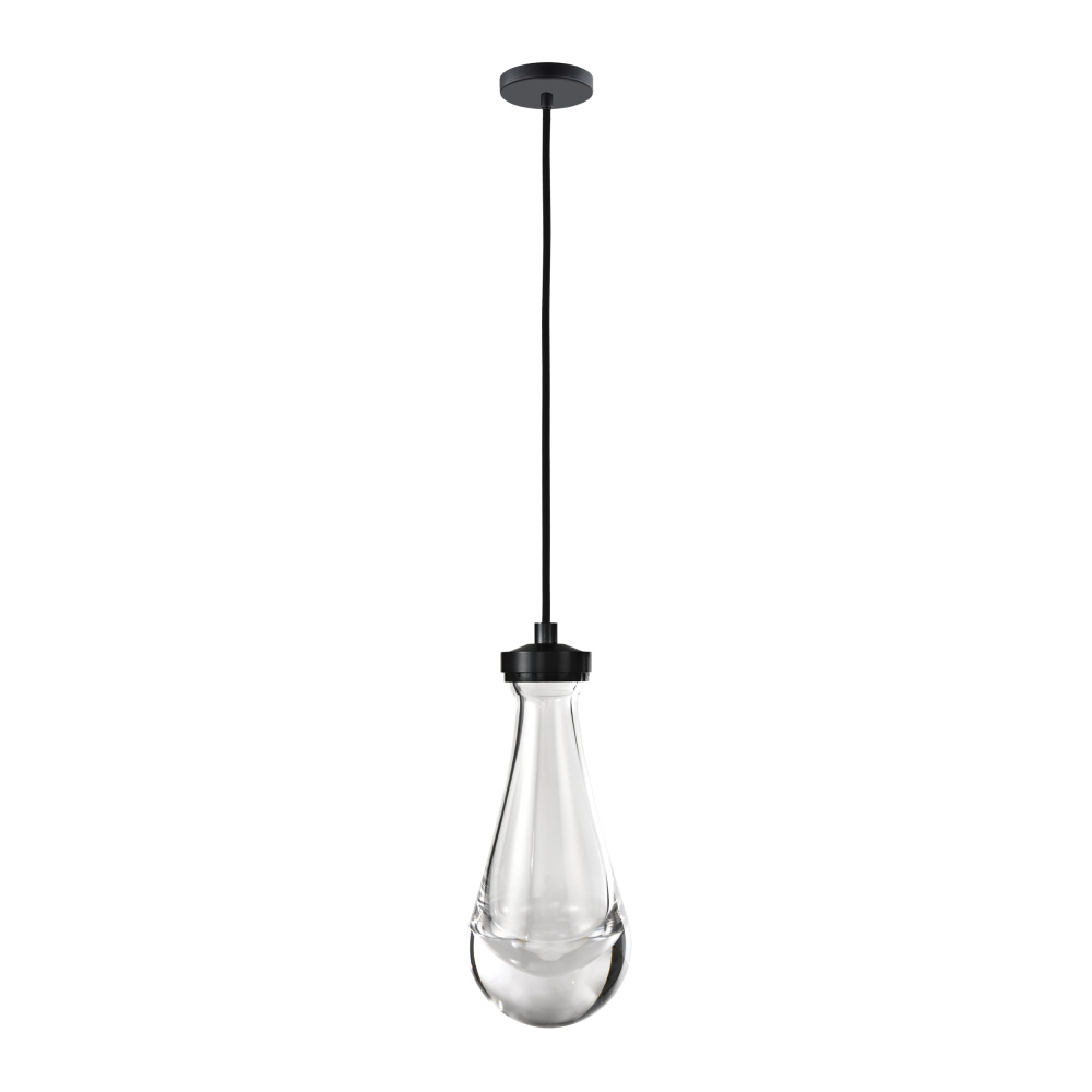 LED 5" Mini-Pendant with solid heavy clear glass shaped as a rain drop. Refined metal details with our sleek satin brushed black finish. Integrated Replaceable LED with 3CCT 3000K, 3500K and 4000K and optional installation of suspension stems or just hang by black weaved fabric wire.