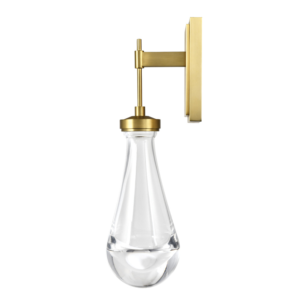 LED 5" Vertical Wall Sconce with solid heavy clear glass shaped as a rain drop. Refined metal details with our premium aged brass finish. Adjustable arms for unique designs and integrated Replaceable LED with 3CCT 3000K, 3500K and 4000K.