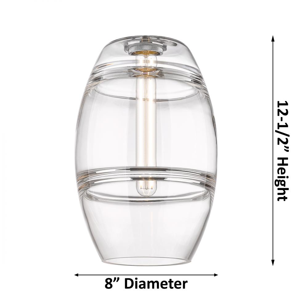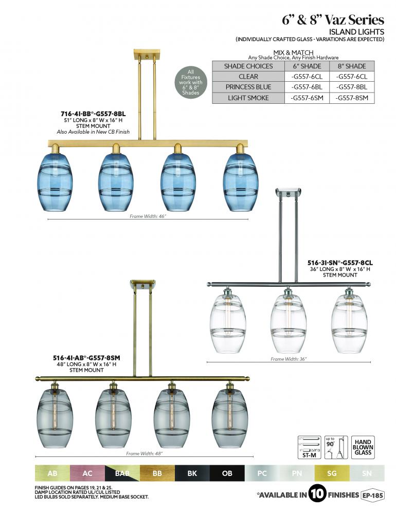 The Vas Series is meticulously handcrafted, showcasing exquisite glass band detailing. These bands are the result of a complex and delicate glassblowing technique, making each pendant truly one-of-a-kind. While the exterior of the glass shade has a sleek a