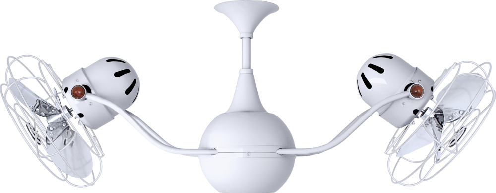 The Vent-Bettina rotational ceiling fan is thoughtfully designed with its arms gently upward curving. The fan offers fluid lines and quiet axial rotation. The fan heads can be infinitely positioned in 180-degree arcs for optimum air movement; the greater the angles of the motors to the horizontal support rods (up or down), the faster the axial rotation. A slow, controlled axial rotation is achieved by both fan head position and fan blade speed.