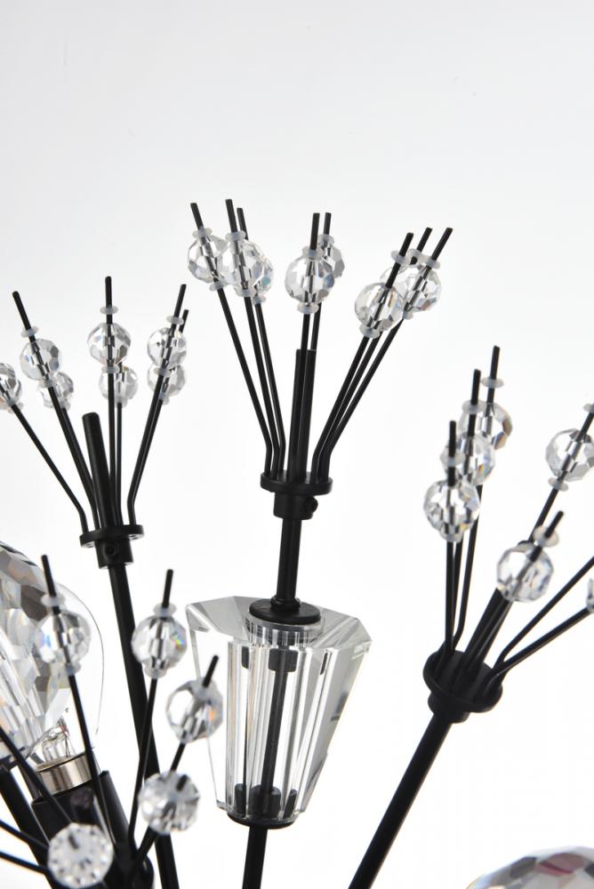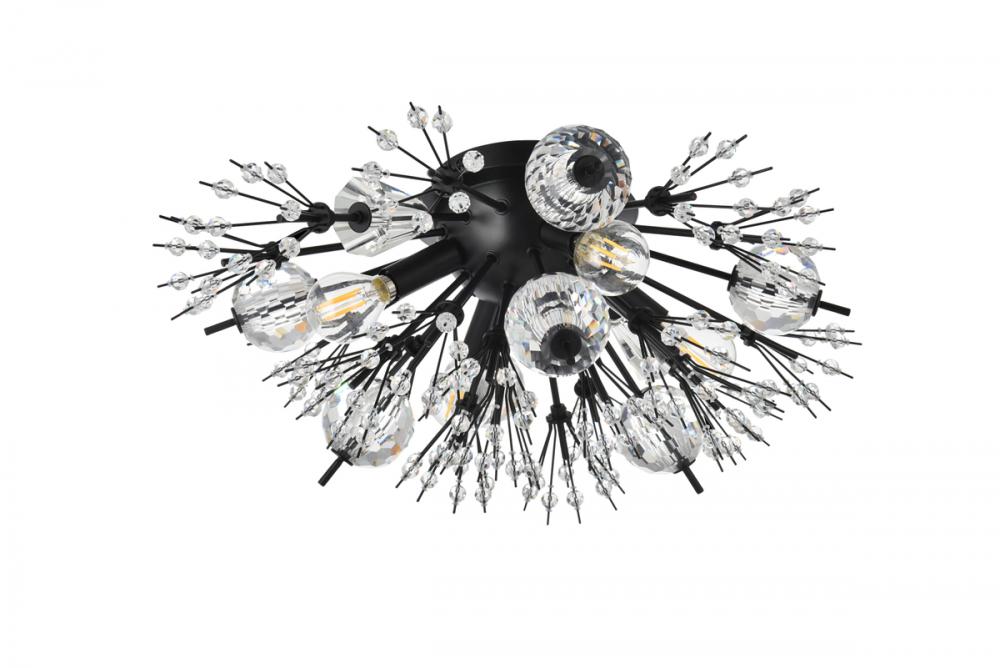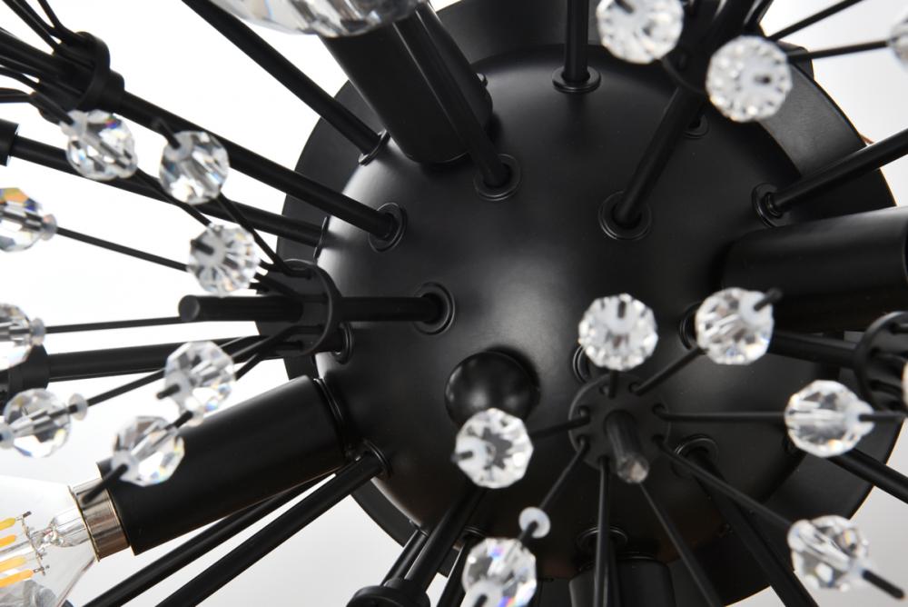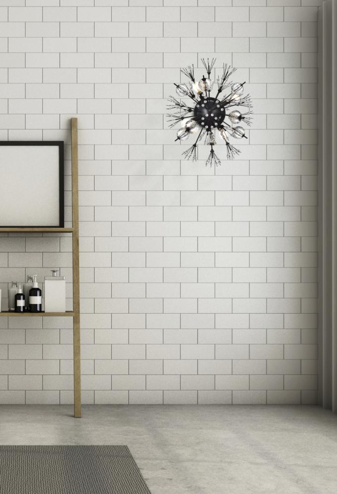 Like an explosion frozen in time, Vera collection are suspended chaos. Clear large crystal balls and sprays of smaller crystals swirl amidst exposed candelabra bulbs (not included). At the epicenter of the storm, a hemispherical steel backplate in a metal finish attaches to the wall or the ceiling. A touch of savage beauty that easily compliments a bathroom, entryway, or bedroom.