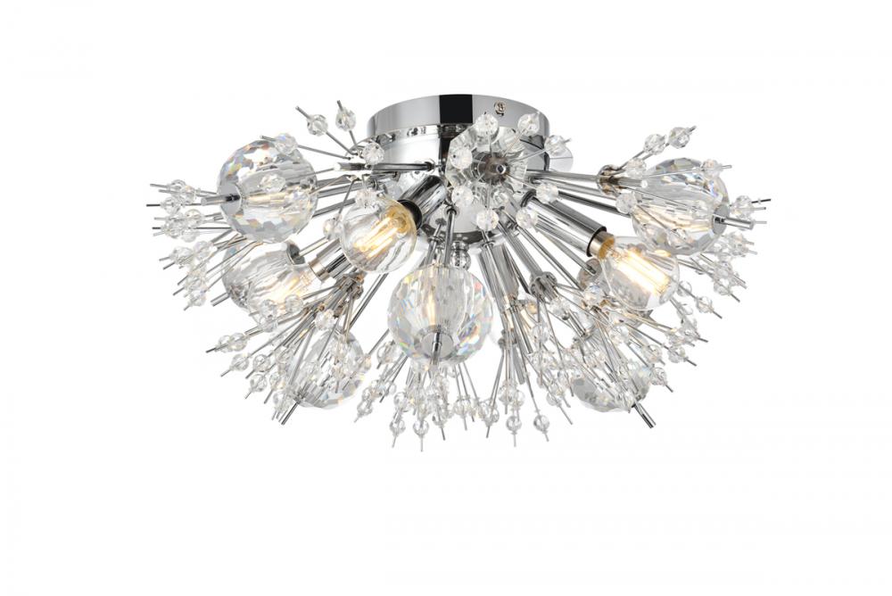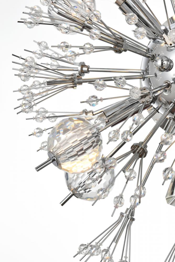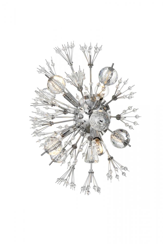 Like an explosion frozen in time, Vera collection are suspended chaos. Clear large crystal balls and sprays of smaller crystals swirl amidst exposed candelabra bulbs (not included). At the epicenter of the storm, a hemispherical steel backplate in a metal finish attaches to the wall or the ceiling. A touch of savage beauty that easily compliments a bathroom, entryway, or bedroom.