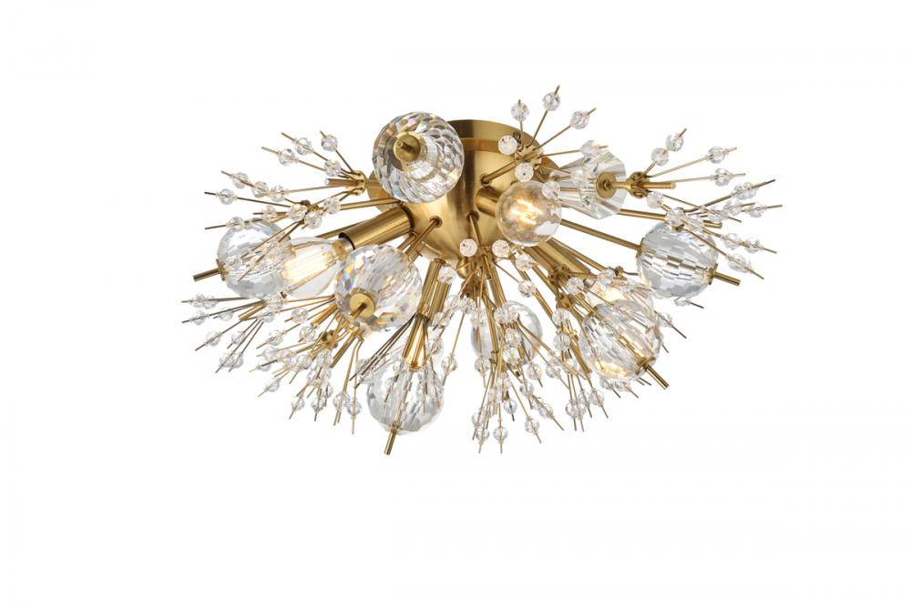 Like an explosion frozen in time, Vera collection are suspended chaos. Clear large crystal balls and sprays of smaller crystals swirl amidst exposed candelabra bulbs (not included). At the epicenter of the storm, a hemispherical steel backplate in a metal finish attaches to the wall or the ceiling. A touch of savage beauty that easily compliments a bathroom, entryway, or bedroom.