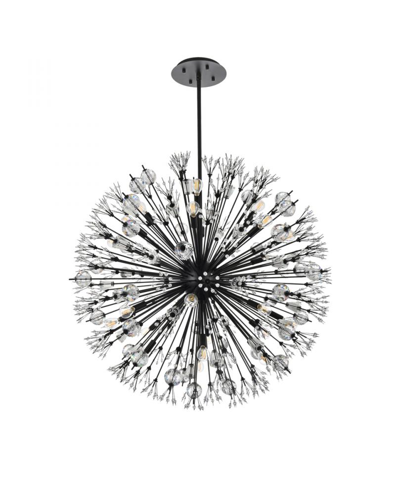 Like an explosion frozen in time, Vera collection hanging fixtures are suspended chaos. Clear large crystal balls and sprays of smaller crystals swirl amidst exposed candelabra bulbs (not included) balanced on dainty wires. A gleaming steel sphere forms the epicenter of the storm. A touch of savage beauty that easily compliments a kitchen, entryway, or bedroom. Sloped ceiling adaptable with a durable swivel could be mounted on vaulted or angled ceilings