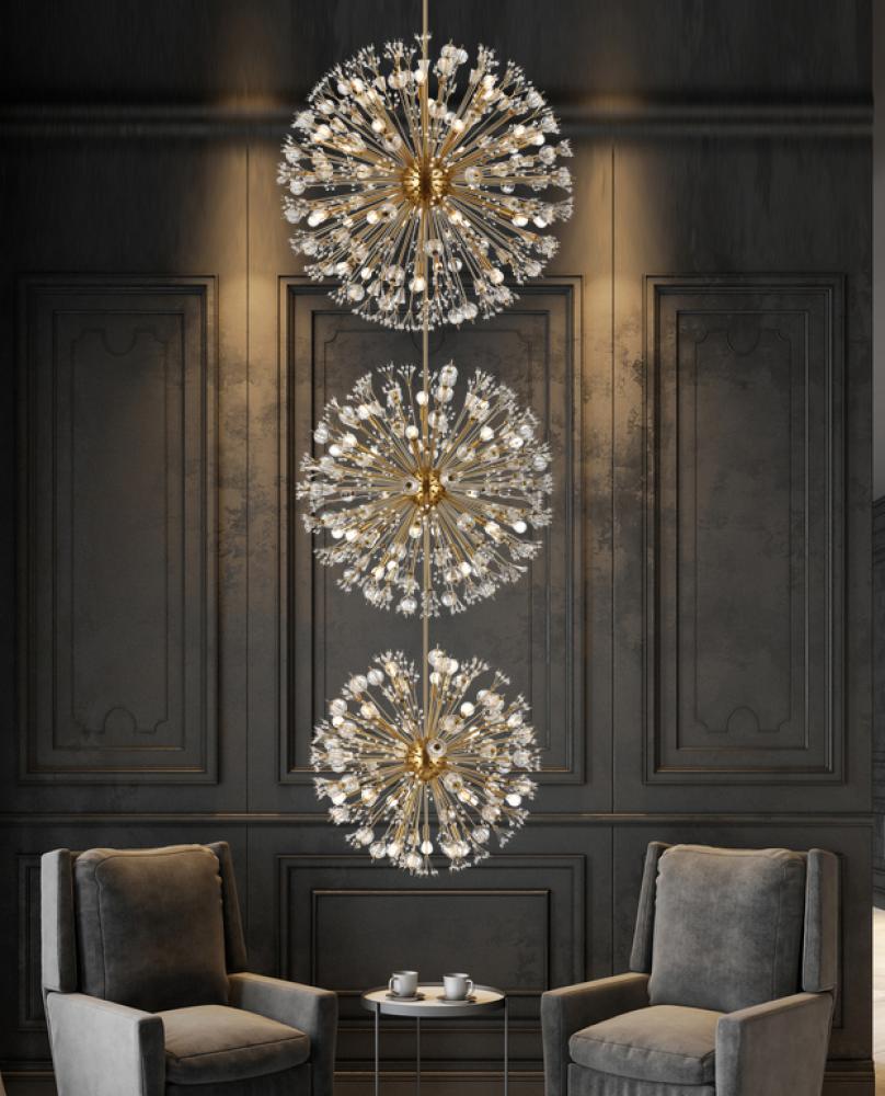 Features a captivating starburst design, creating a visually stunning centerpiece for your foyer. The arrangements of crystal and metal elements in a radial pattern adds a touch of modern elegance and sophistication to any space.