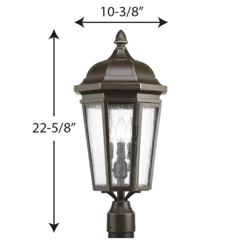 Antique Bronze finish.;Traditional style.;Classic and formal clear seeded glass.;Hinged door for easy access to replace lamps.;Fits 3" post (order separately).