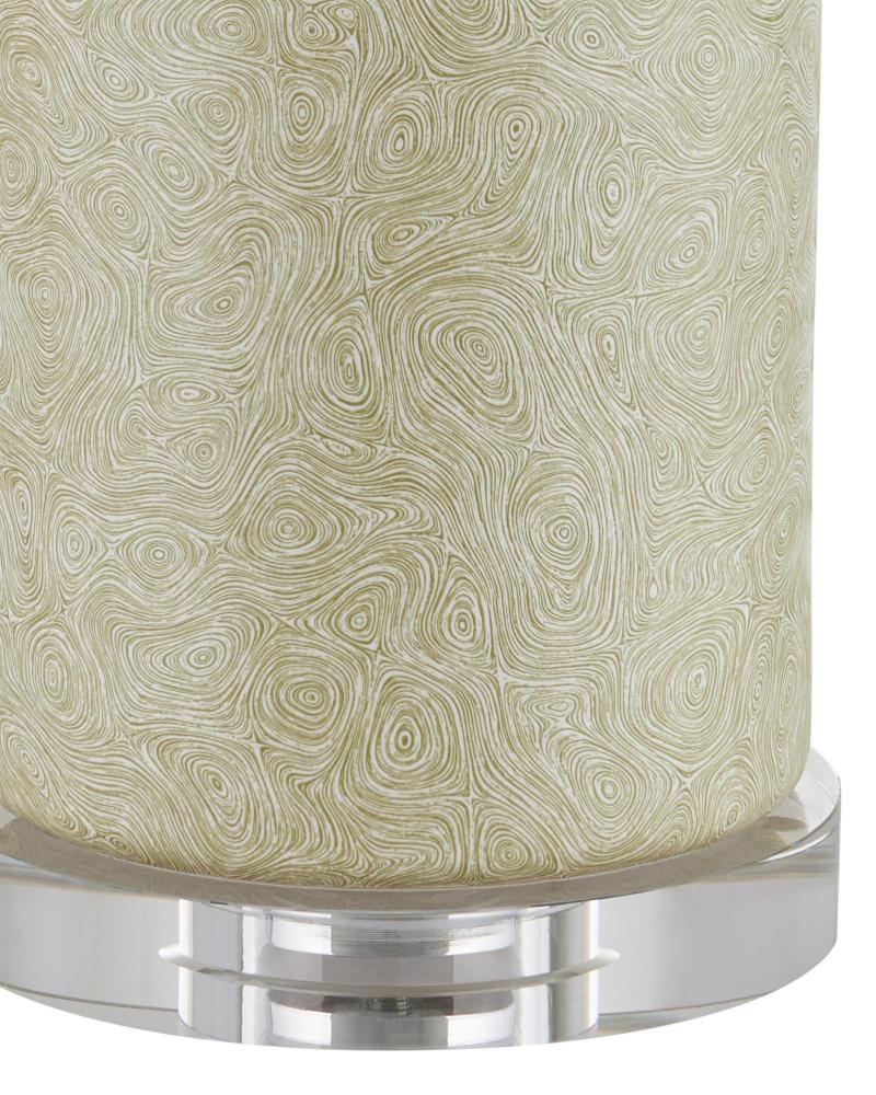 The Verdure Cylinder Table Lamp has a sophisticated swirling green and white pattern on its surface, which recedes to a lovely stippled effect when seen from far away. The interlocking amoeba shapes only appear when one draws near the green table lamp made of porcelain. The columnar body that sits atop an optic crystal base is capped with a metal plate in a satin nickel finish. The optic crystal finial echoes the sleekness of the lamp's body.