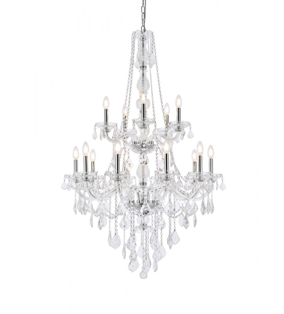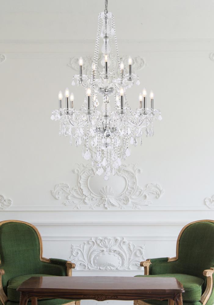 The chandeliers of the Verona collection are the epitome of breathtaking beauty and elegance. Cut-crystal center columns and gently sweeping arms hold 15 candelabra lights (not included) and crystal bobéches, each arm with its own adornments of draped crystal beads, balls, rings, and pendeloques. Inspired by the resplendent chandeliers preferred by English aristocrats in the 18th century, today’s Verona fixtures unmistakably project an aura of luxury and style. Available with a variety of finishes and many different types of crystal.