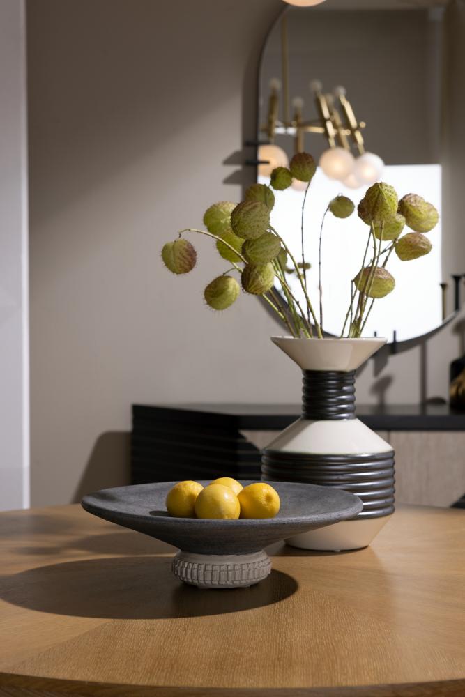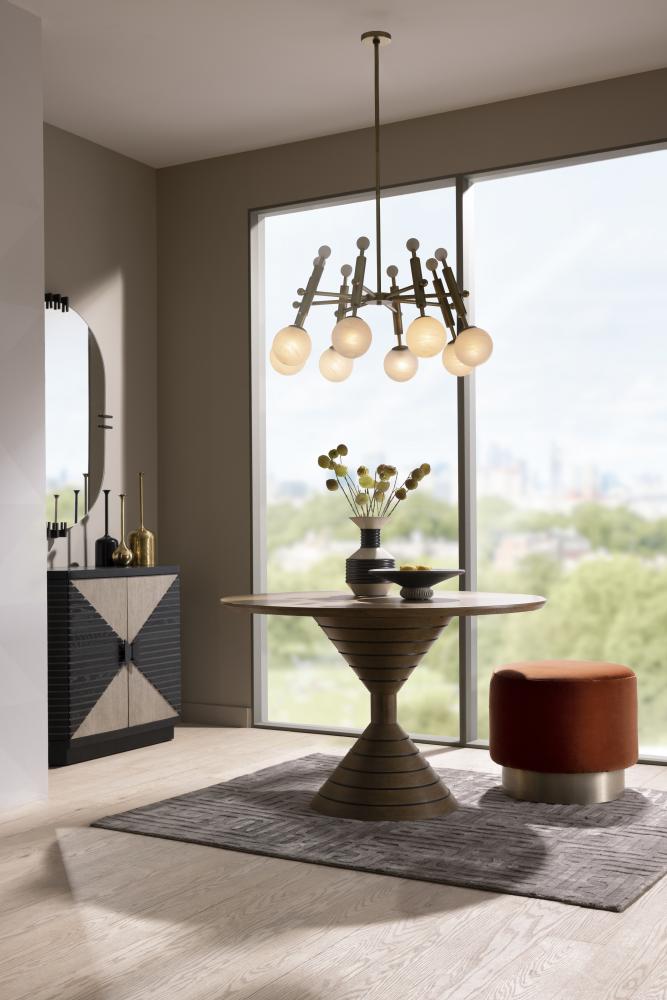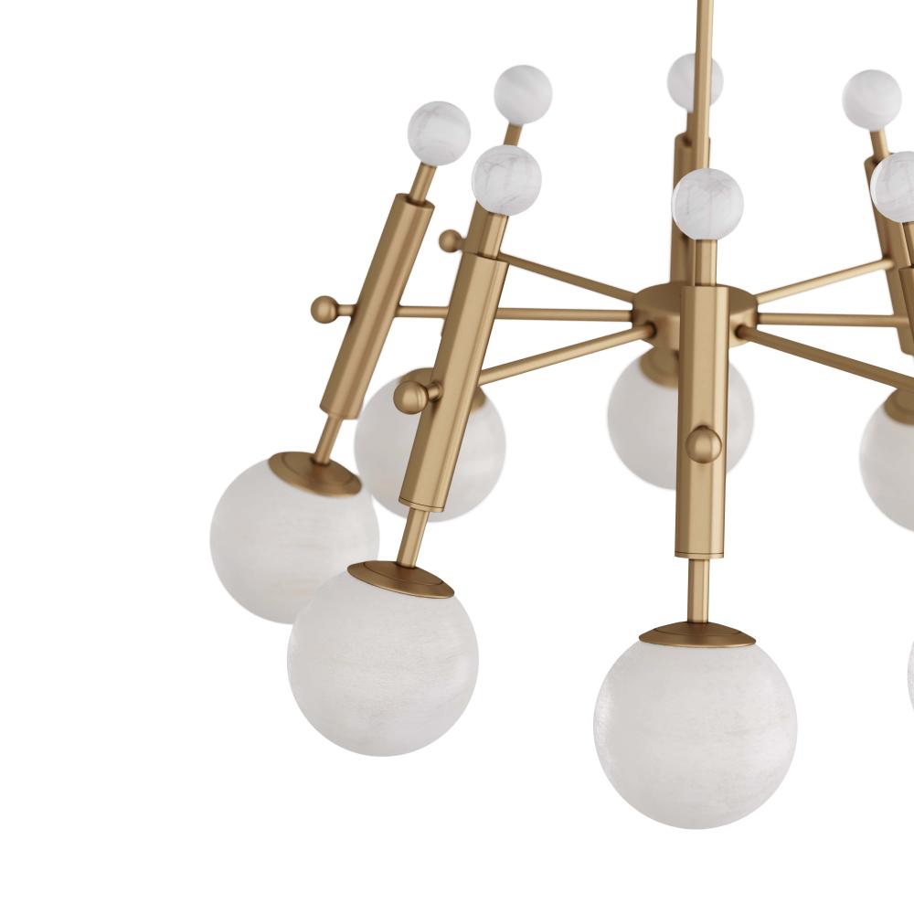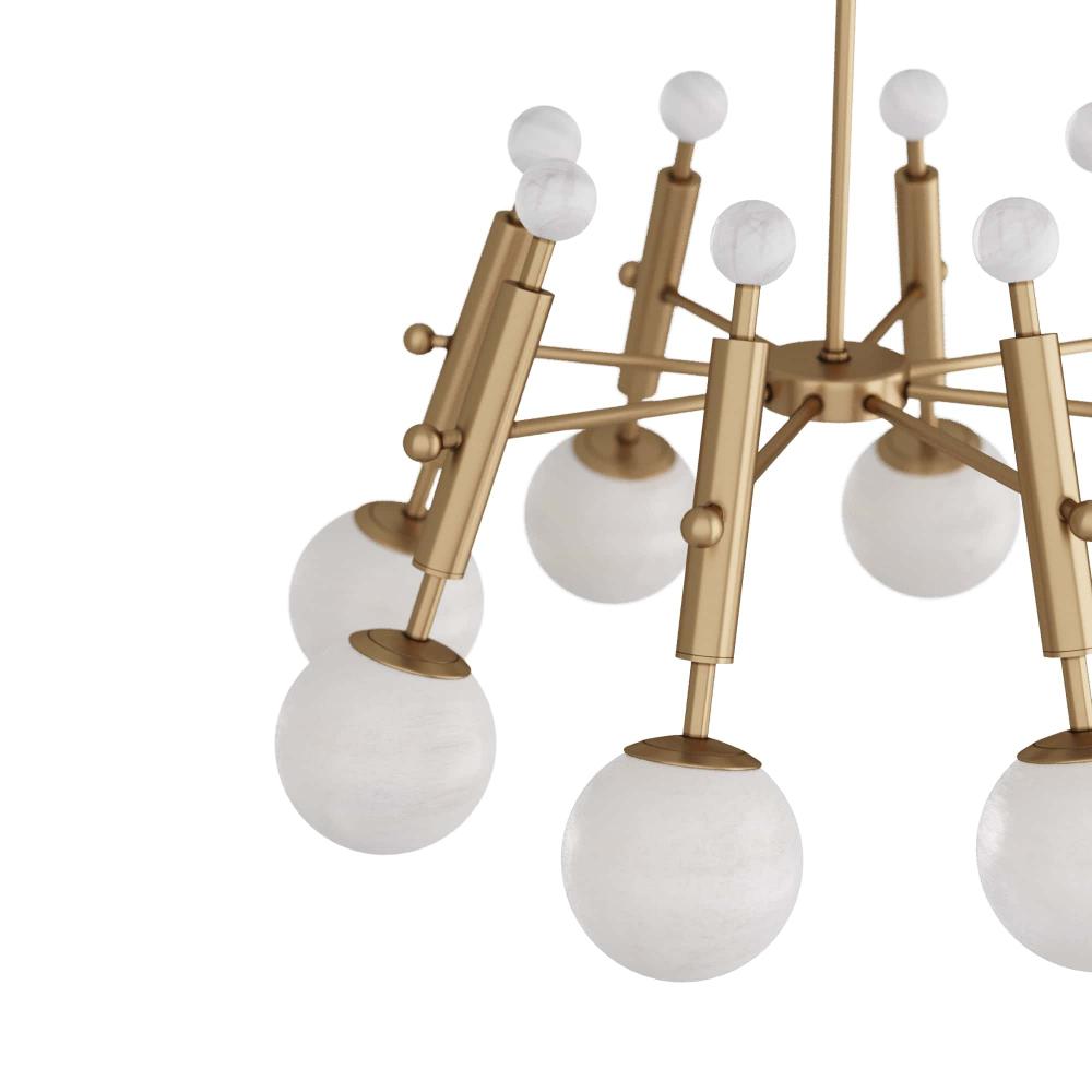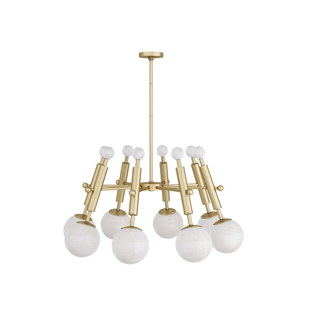 LOADED WITH VISUAL INTEREST, THE VERONA CHANDELIER IS FASHIONED WITH A SLANTED, UMBRELLA-SHAPED, PIPED FRAMEWORK IN ANTIQUE BRASS IRON AND OPAL-SWIRL GLASS SHADES. THE DYNAMIC PIECE IS EMBELLISHED WITH WHITE ALABASTER ORBED FINIALS THAT TOP EACH OF THE EIGHT LIGHTS. FINISH WILL VARY.