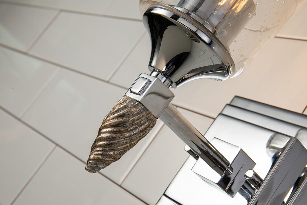 A 1950s-inspired Vetiver sconce in polished chrome with a silver finial and seeded glass. Its double square backplate adds vintage charm to bedrooms, dining, nooks, or bathrooms, blending retro style with sleek, shiny light.