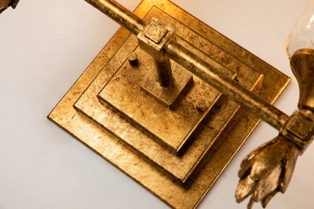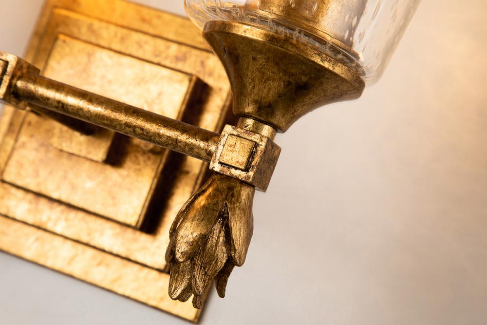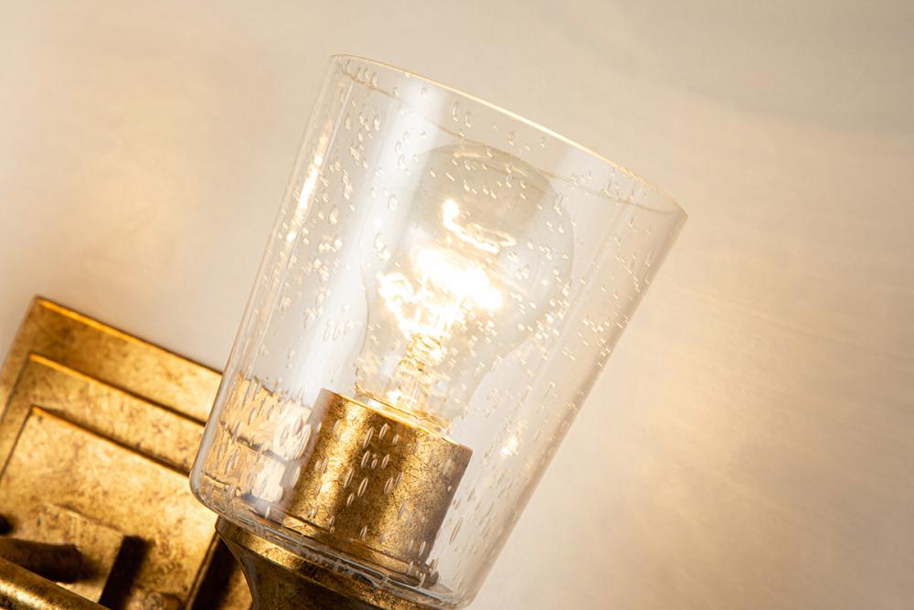 A 1950s-inspired Vetiver sconce in antique gold with a gold finial and seeded glass. Its double square backplate adds vintage charm to bedrooms, dining, nooks, or bathrooms, offering a warm, stylish glow with retro flair.