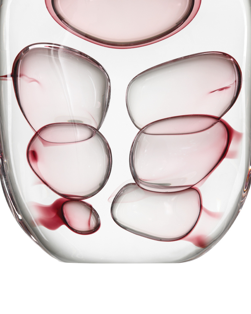 The Vicolino Medium Vase is made of clear and purple hand-made glass with organic bubbles floating within its overall form. The vase was created using a Venetian glass technique that is very rarely practiced in modern times. The slim silhouette has a shape that is reminiscent of a perfume bottle, the narrowness making the vase ideal for nightstands, smaller consoles, or shelves that are not very deep. Both sculptural and functional, this vase will be a glamorous accent piece in the most sophisticated setting.