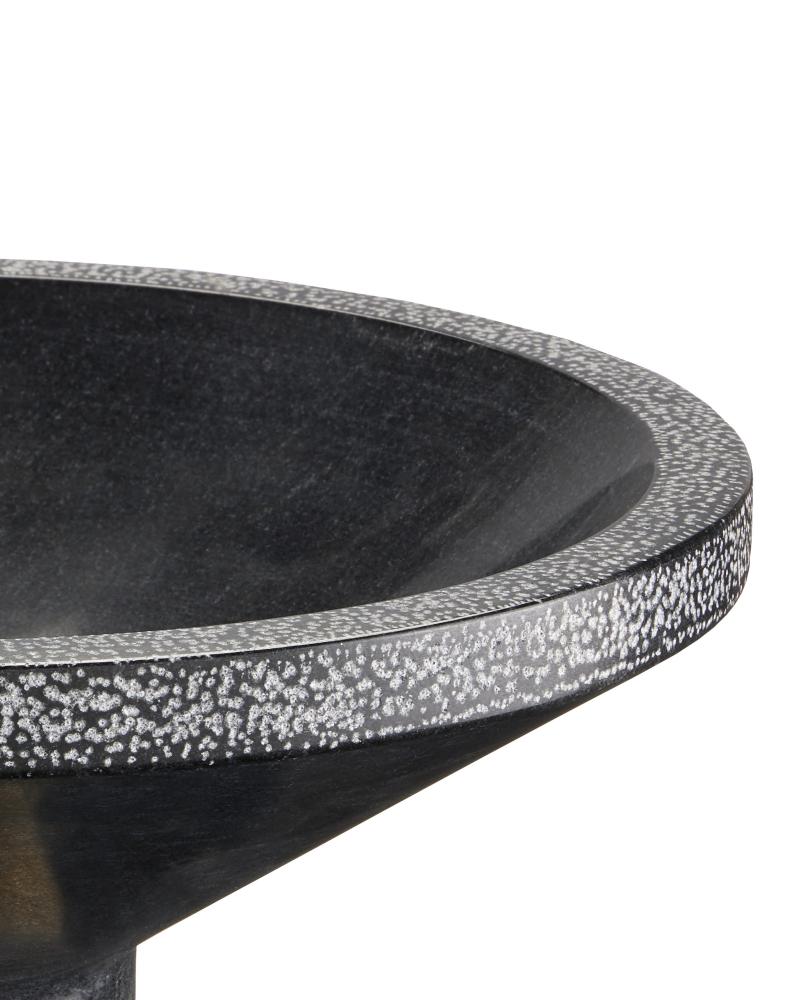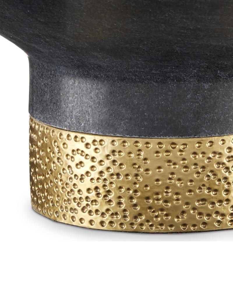 The Vincent Black Marble Bowl is made of solid marble with a brass-claded base and chiseled details on the edges, which bring it added texture. The base also has a stippled surface achieved when artisans chisel the surfaces. Because this black decorative bowl is made of a natural material, slight variations will exist from piece to piece.
