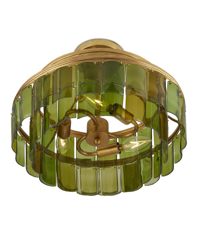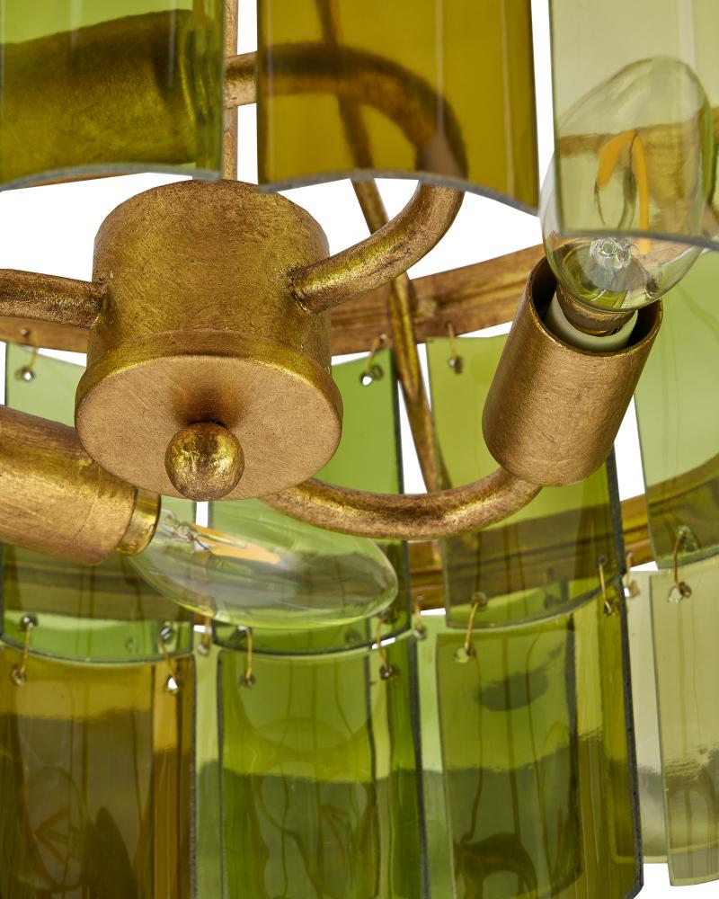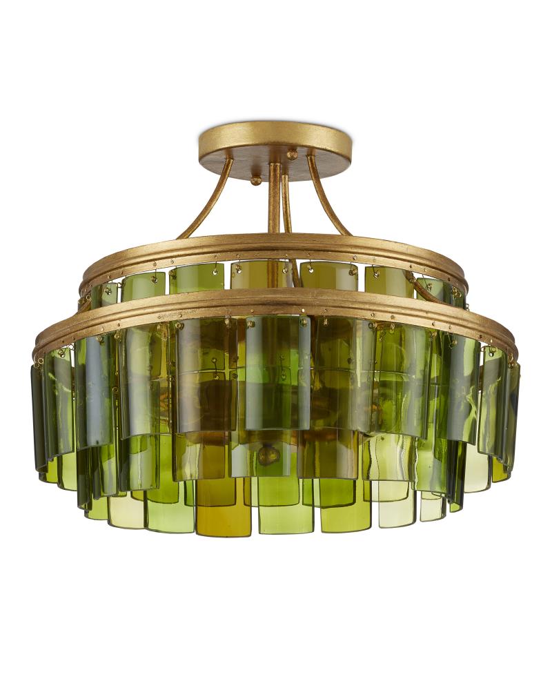 Cascading from the circular frames of our Vintner Green Semi-Flush are individually-cut pieces of green glass made from recycled bottles. The texture created by the varying hues of the glass beautifully complements the dark contemporary gold leaf finish on the wrought iron frame. This green semi-flush is one of several in the Vintner family.