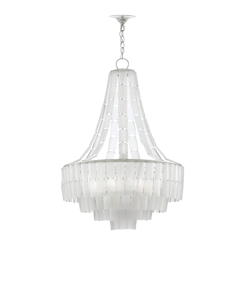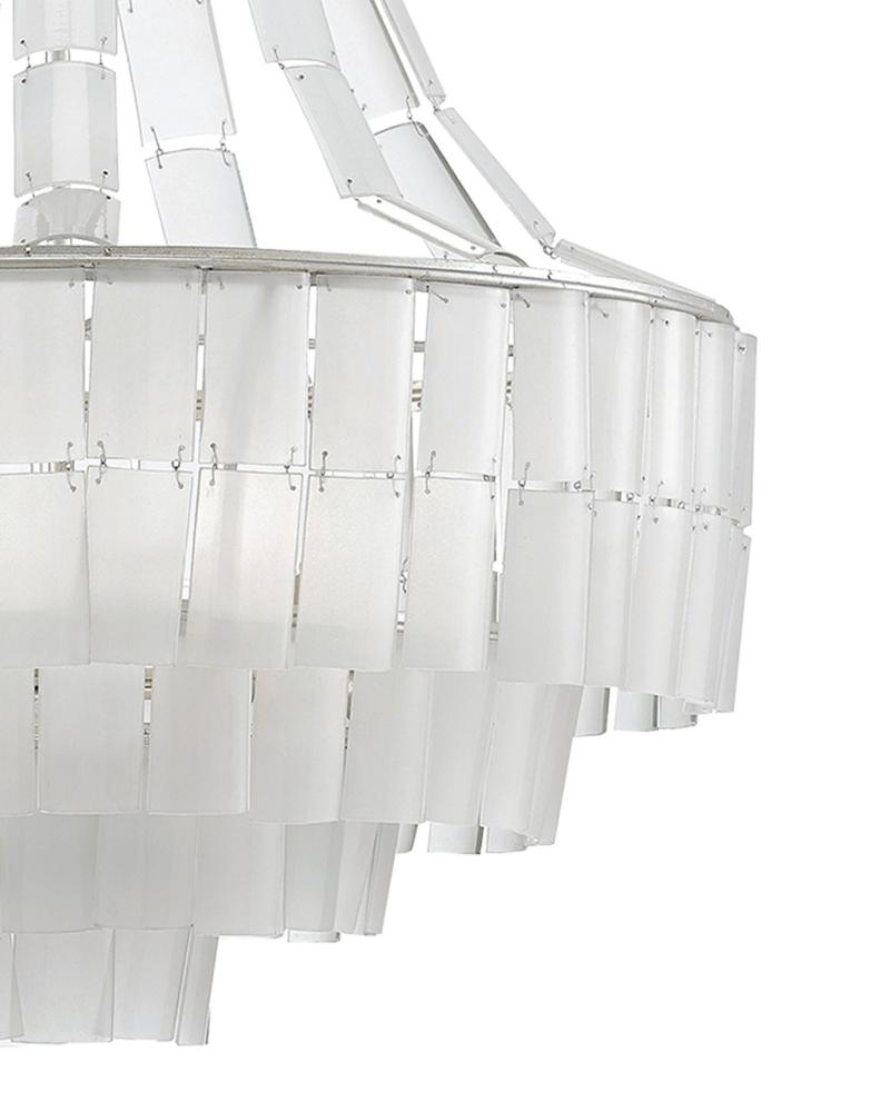 Cascading from the circular frames of the Vintner Blanc Chandelier are individually-cut pieces of frosted glass made from recycled bottles. The texture of the frosted surfaces beautifully complements the contemporary silver leaf finish on the wrought iron frame. This white chandelier is one of several fixtures in the Vintner family. Adjustable from 45.5" to 114.5" with use of included chain/rod kit/cable. If your space calls for a longer drop, additional chain/rods/cable is available for purchase.