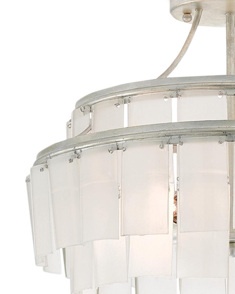 Each row of the Vintner Blanc Semi-Flush is made up of individually-cut pieces of frosted glass made from recycled bottles. The texture of the frosted surfaces beautifully complements the silver leaf finish on the wrought iron frame. This silver flush mount is one of several lights in the Vintner family.