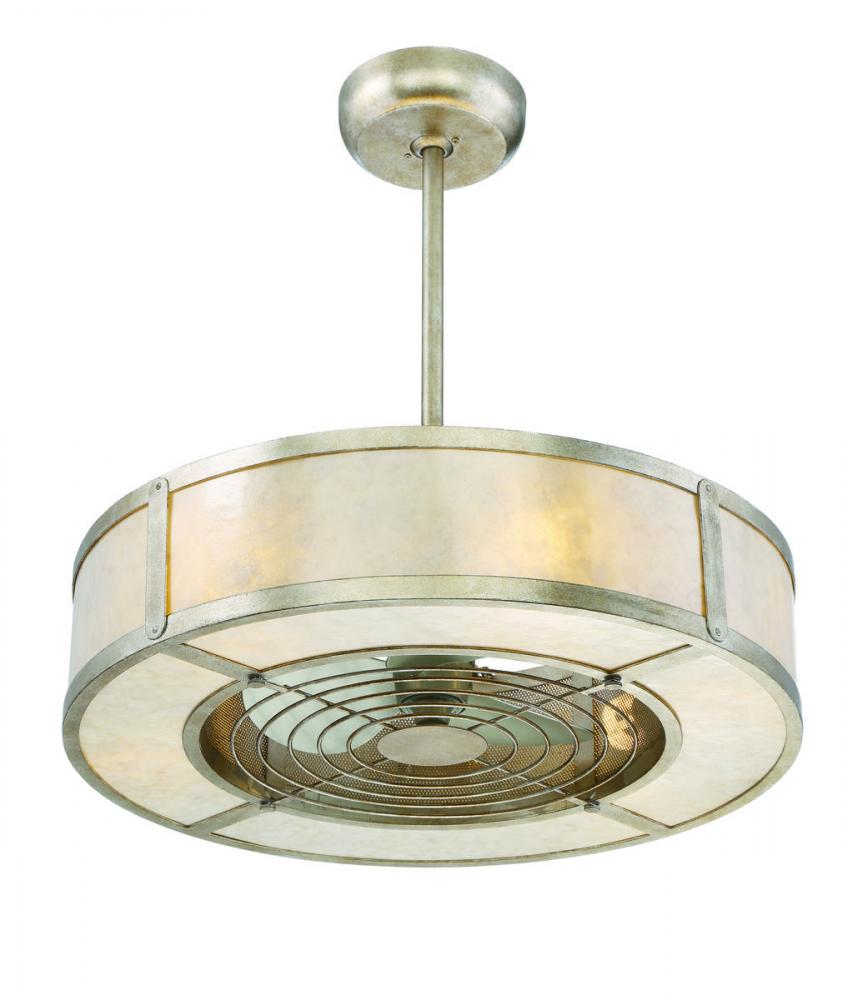 Sleek, sophisticated, and provides superb comfort —the Vireo fan d’lier has the streamlined style of a contemporary chandelier, plus the functionality of a ceiling fan. The single, large drum-shaped shade features wide outlining and a lovely, silver mica finish. And the round ceiling plate, downrod, and fan elements have a complementary, shimmering, silver dust finish. Six dimmable 6W LED bulbs are included, providing plenty of glare-free illumination. This fixture is 26” wide and 30” high, with an inner fan that has a 14” blade span. Plus, a handheld remote is included, so you have independent fan and light control close at hand, for adjustable light and air comfort, with incredibly chic style.