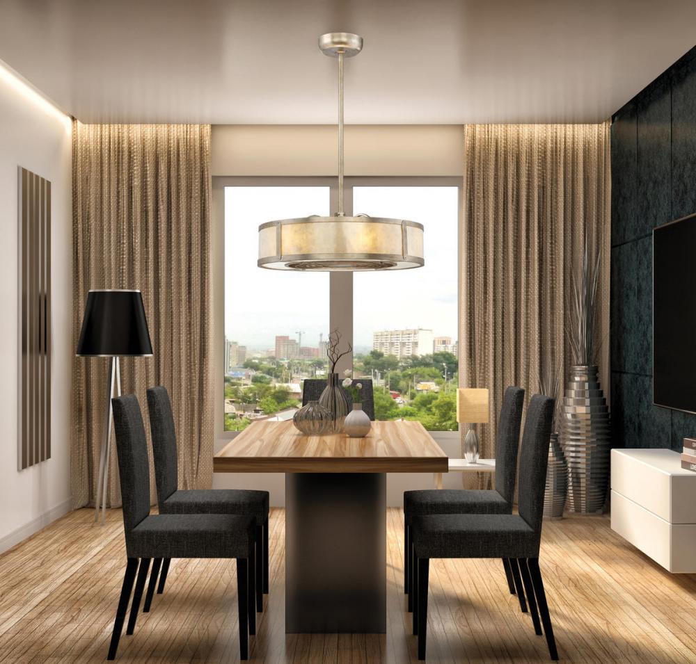 The Savoy House Vireo Fan D'Lier is sleek, sophisticated and provides superb comfort. It has the streamlined style of a contemporary chandelier and the functionality of a ceiling fan. The drum-shaped shade showcases a silver mica shade that pairs nicely with the silver dust finish. This fixture is 26" wide and 13.26" high. Six dimmable 6W LED bulbs are included, providing plenty of glare-free illumination. A handheld remote is also included, so you have independent fan and light control close at hand.