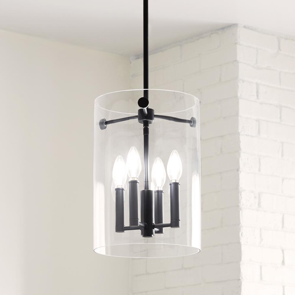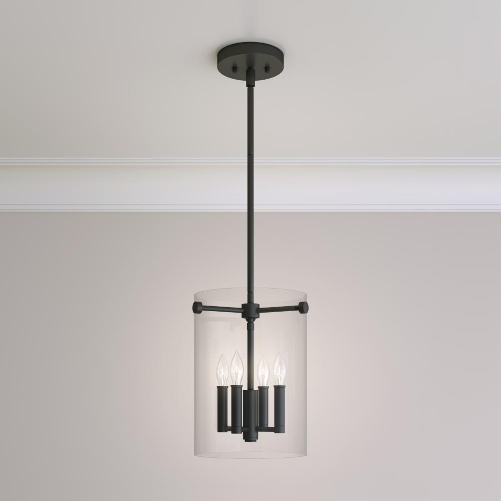 The Vissi Family of pendant lighting sets a distinct tone with classically tailored hardware finished in elegant matte black. The fixtures feature 4 candle-style lights dramatically suspended within the clear, frameless, floating glass shade for a minimalistic take on traditional design. The overall effect provides the perfect lighting solution for dining areas and entryways.