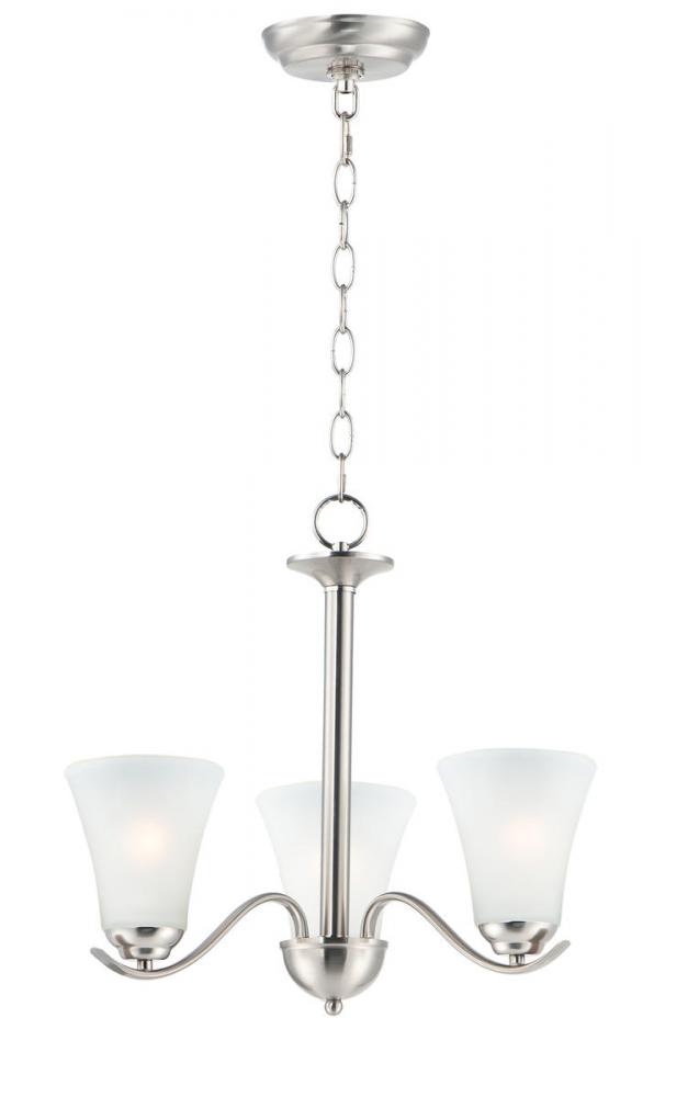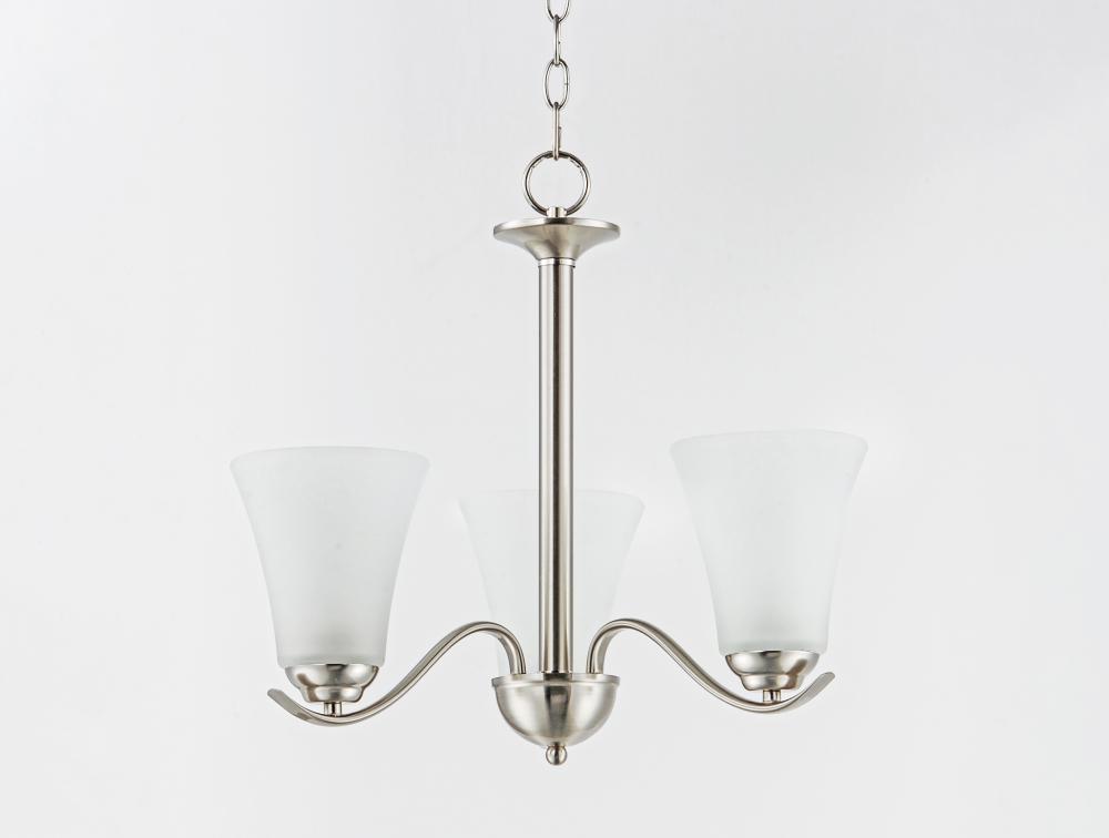 Gently waving arms of Satin Nickel or Oil Rubbed Bronze support tall-profile Frosted glass shades creating a scale normally not found in this category of lighting. The bath vanity may be installed up or down and also includes a Polished Chrome finish.