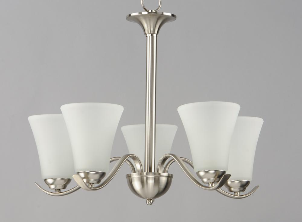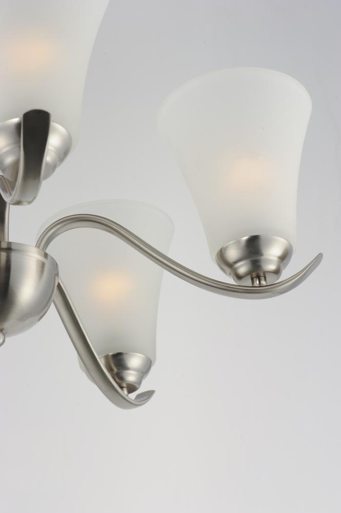 Gently waving arms of Satin Nickel or Oil Rubbed Bronze support tall-profile Frosted glass shades creating a scale normally not found in this category of lighting. The bath vanity may be installed up or down and also includes a Polished Chrome finish.