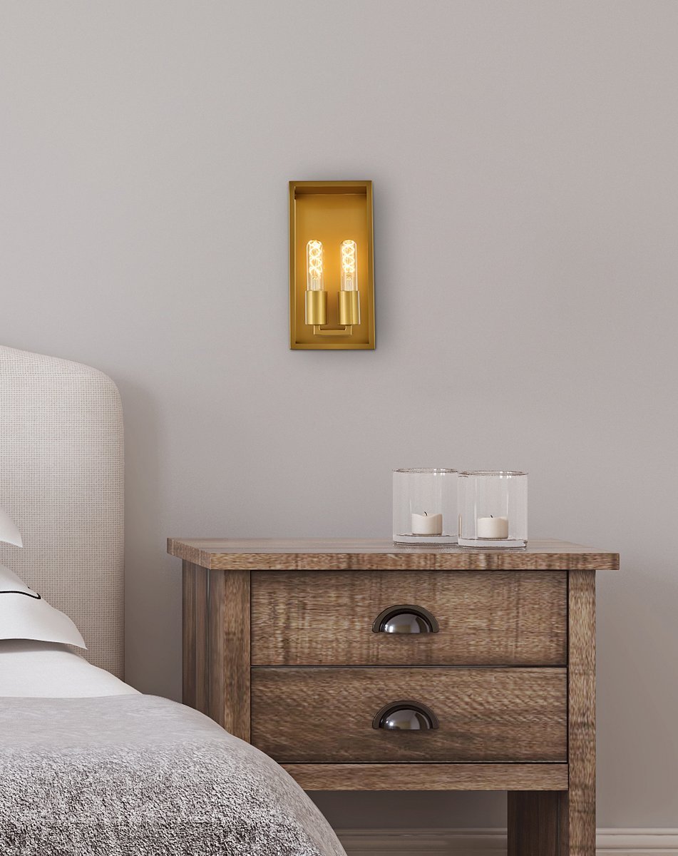 Voir 2 lights wall sconce in brass is the perfect fixture to light up the hallway, closet, bedroom, or bathroom. This flush mount will elevate the look of any space.