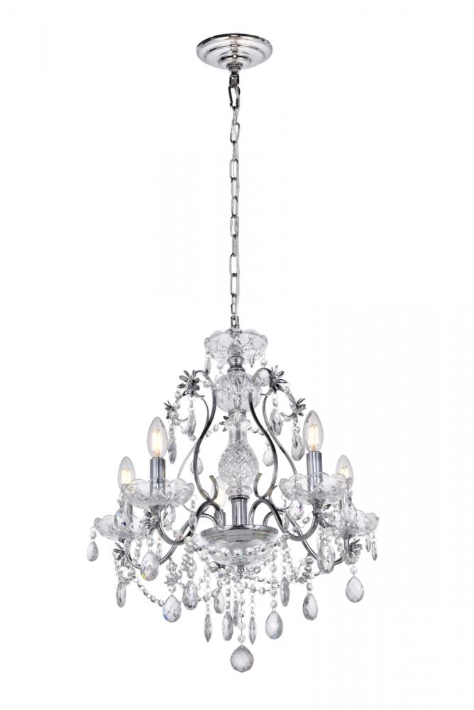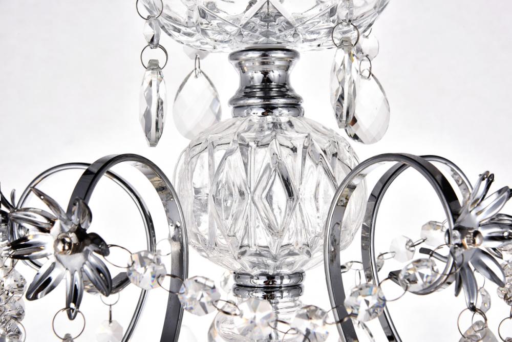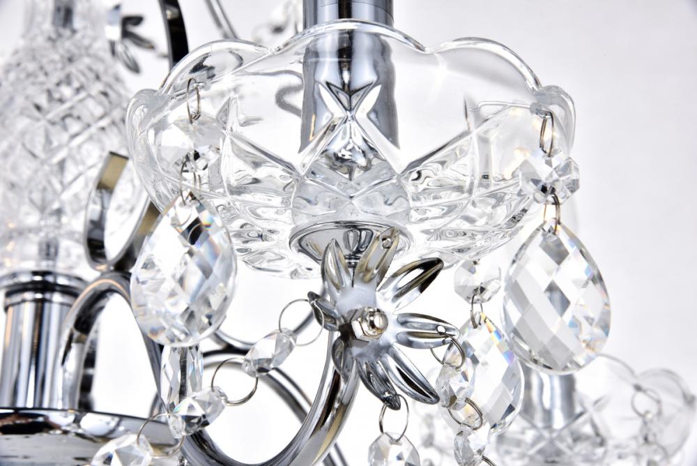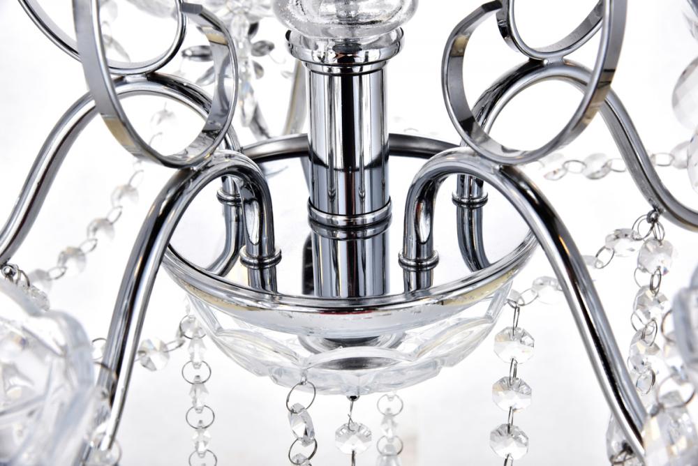 Glamour has never been this enlightening. Voltaire collection hanging fixtures are reinventing the classical chandelier. The graceful frame in a gleaming Chrome finish forms swirling arms that are underscored by dangling festoons of clear Crystal octagon strands and sparkling clear royal-cut Crystal teardrop pendants. An ornate pressed-Glass center column with corresponding bobèches contrast with the tapered Metal flower-shaped accents. With two alternate size options, these chandeliers are ideal for a dining room, stairwell, living room, or bedroom.