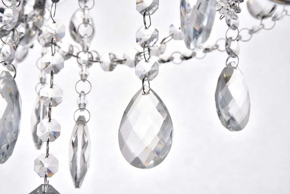 Clear, faceted almond-shaped crystals hang from additional crystal strands, adding depth and interest to this fixture.